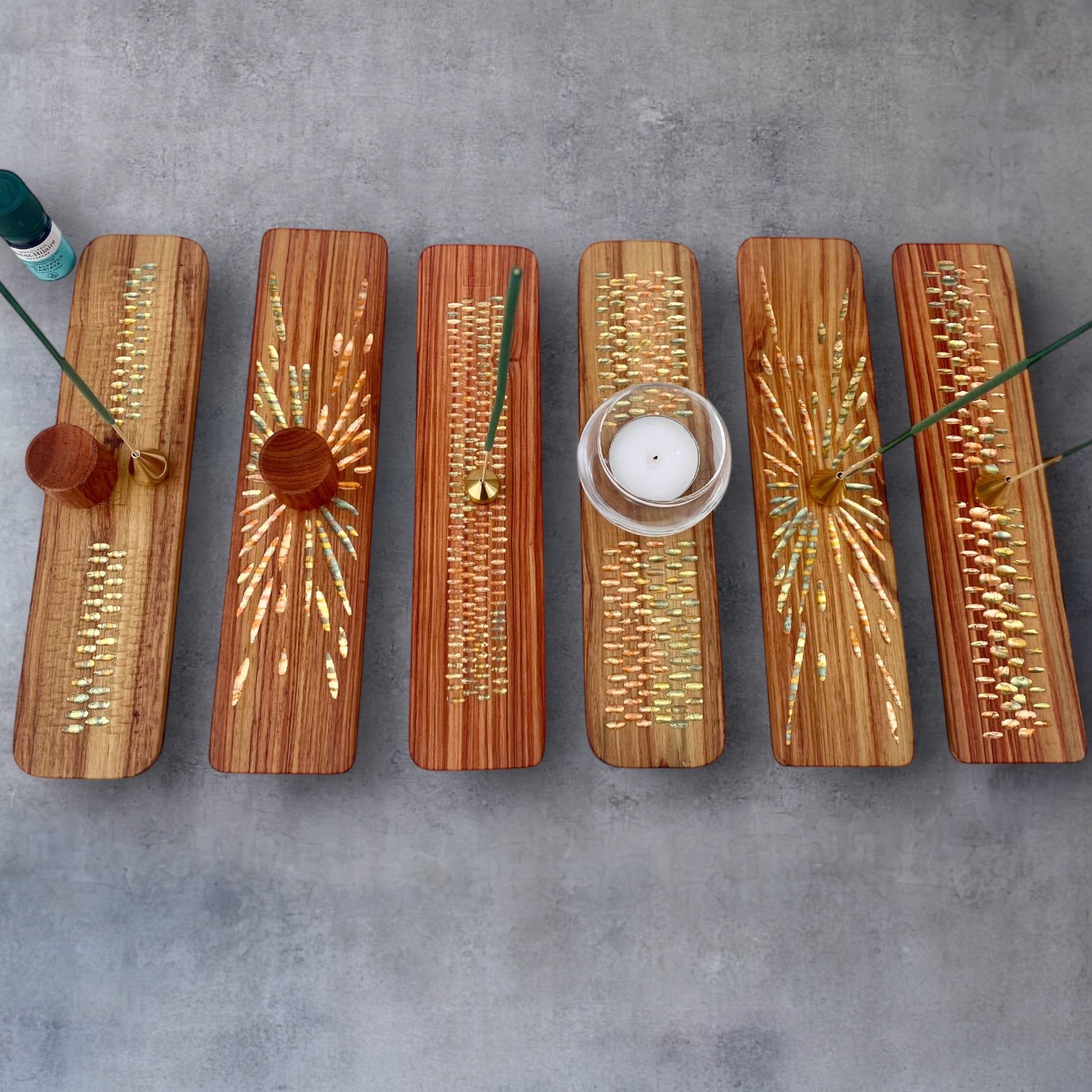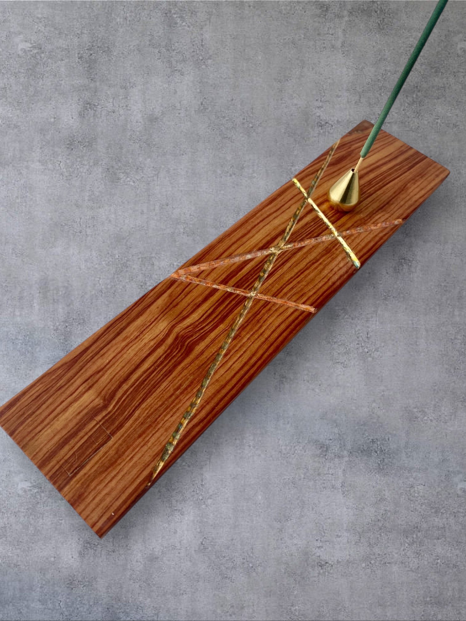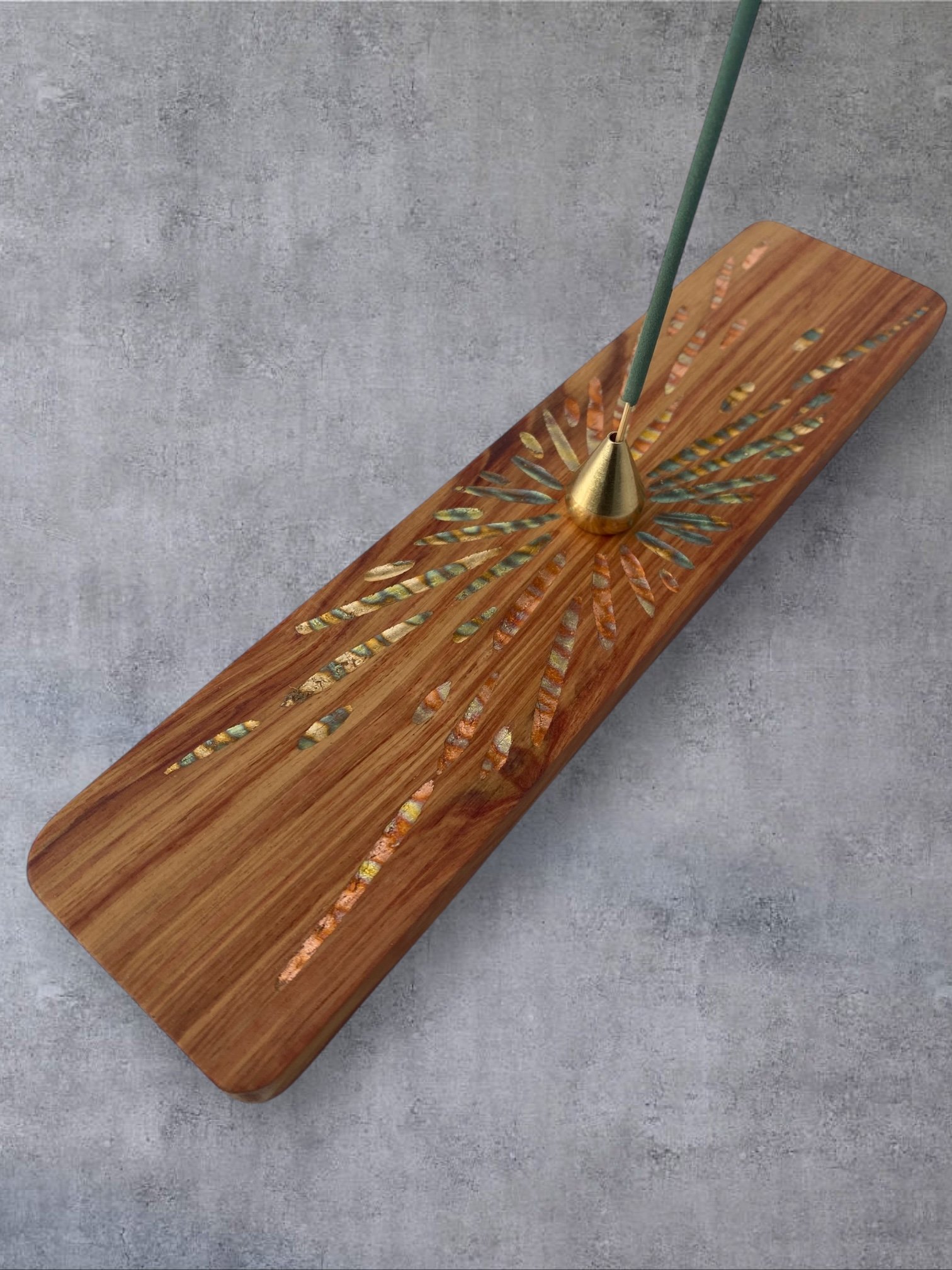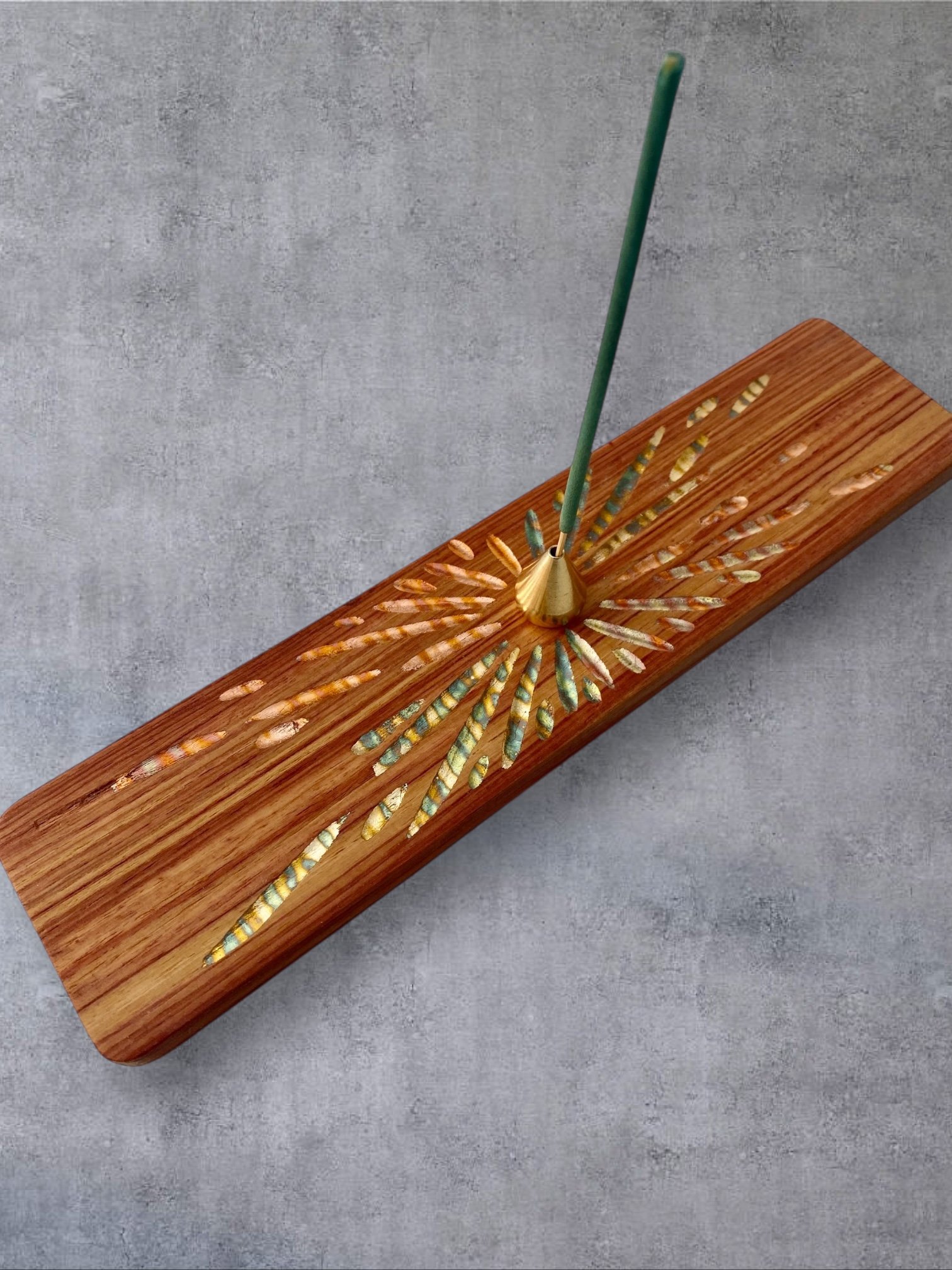 Sur chacun des porte-encens, je sculpte à la gouge des reliefs sobres et tactiles. Ces creux accueillent des feuilles de cuivre oxydées dont les teintes oscillent entre bleus profonds et rougeoiements moirés. Le métal, posé comme un fil de lumière dans le bois, capte le regard sans jamais l’éblouir. Ce jeu de matière n’est pas un effet : c’est une manière d’amener la lueur et la senteur au plus près de la main.
