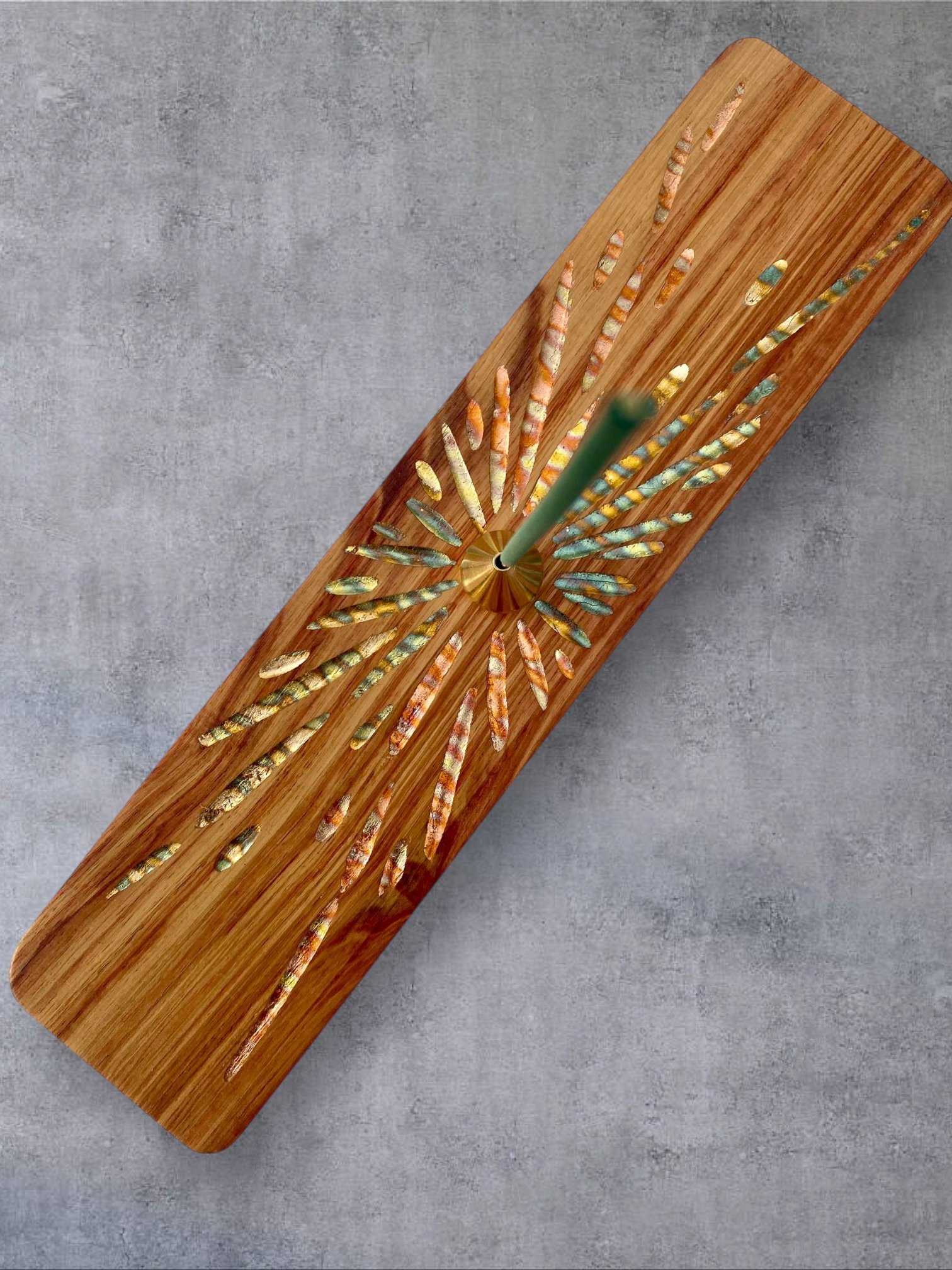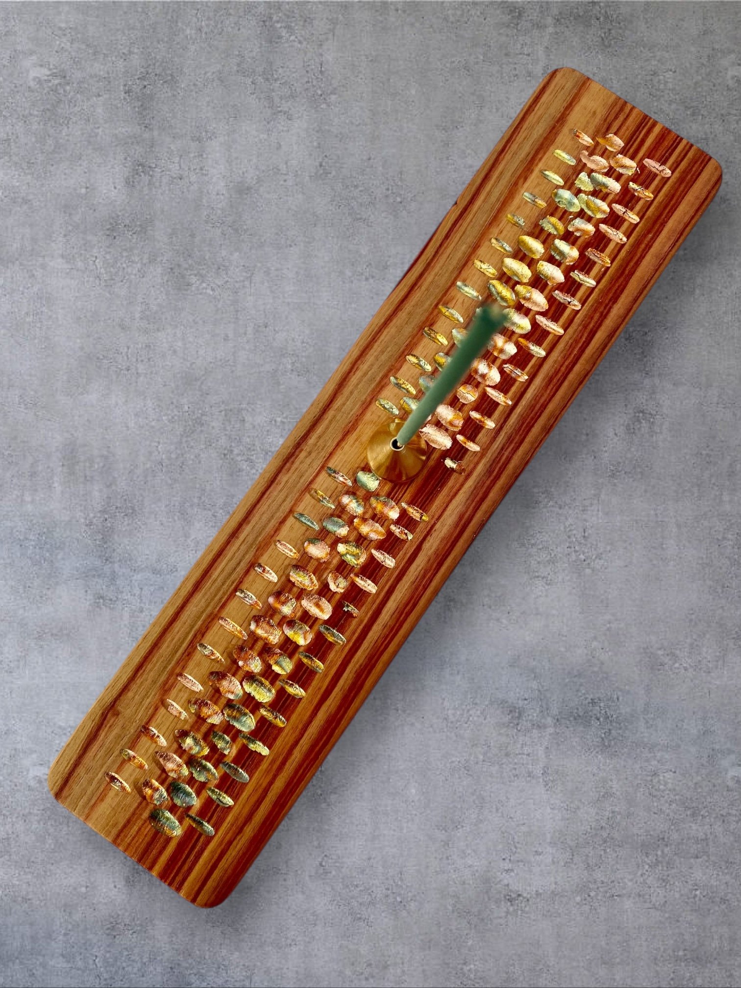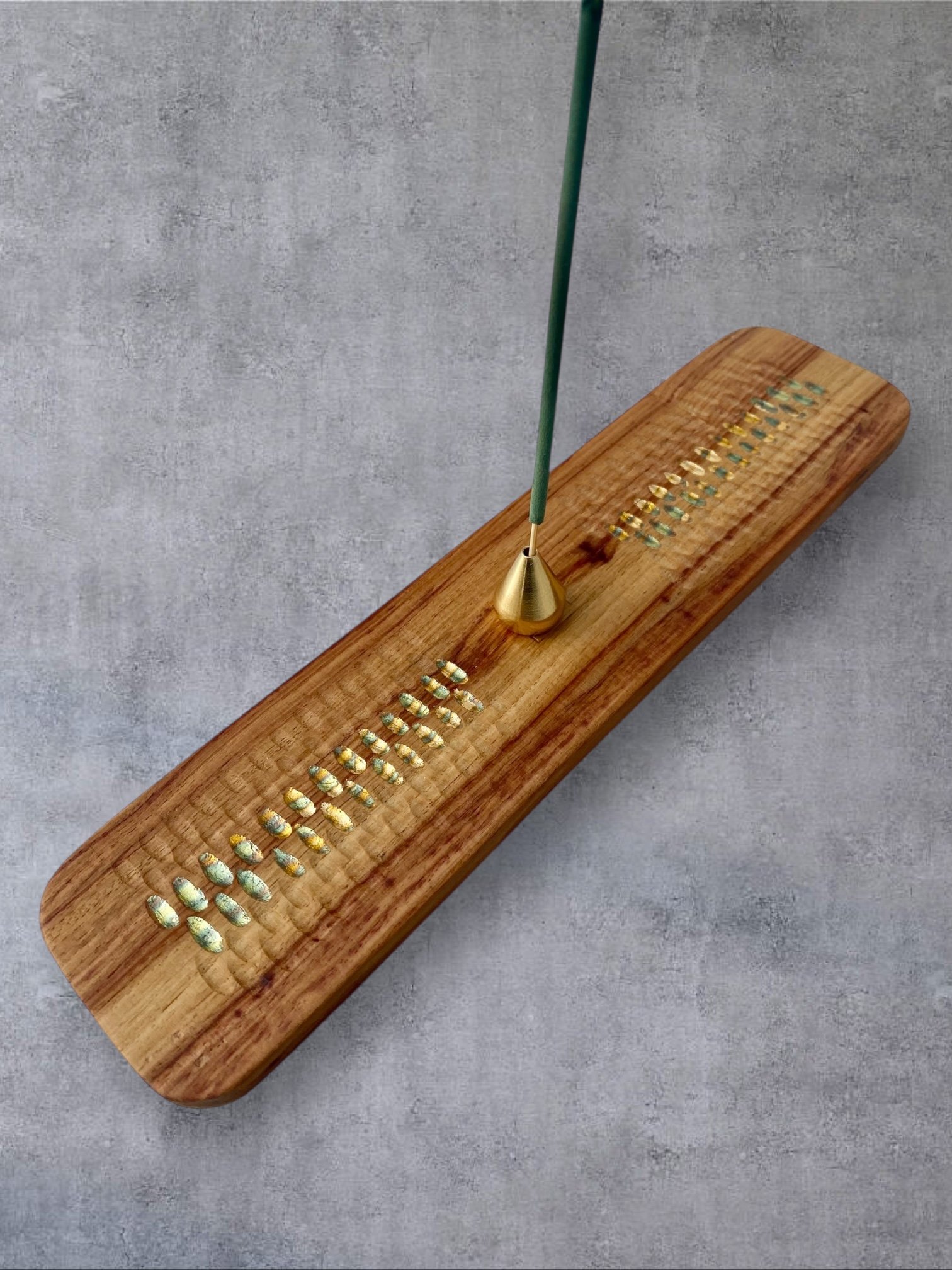 Sur chacun des porte-encens, je sculpte à la gouge des reliefs sobres et tactiles. Ces creux accueillent des feuilles de cuivre oxydées dont les teintes oscillent entre bleus profonds et rougeoiements moirés. Le métal, posé comme un fil de lumière dans le bois, capte le regard sans jamais l’éblouir. Ce jeu de matière n’est pas un effet : c’est une manière d’amener la lueur et la senteur au plus près de la main.