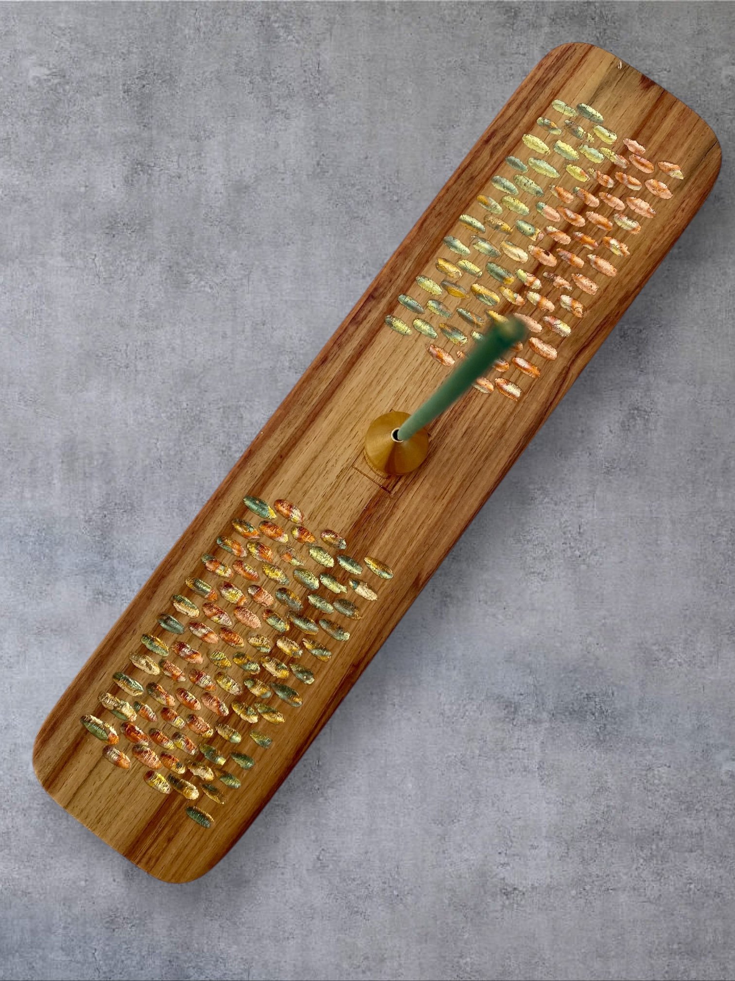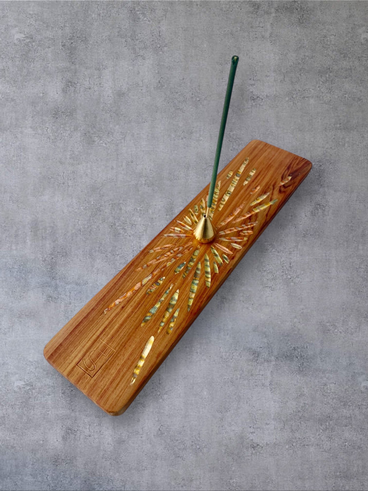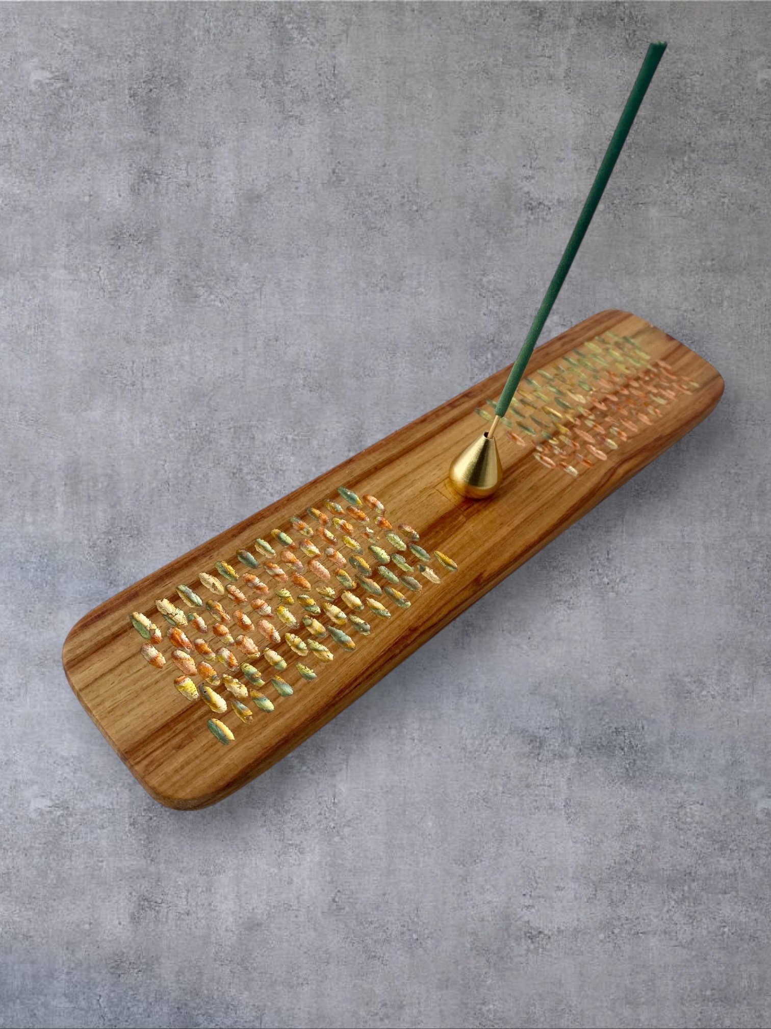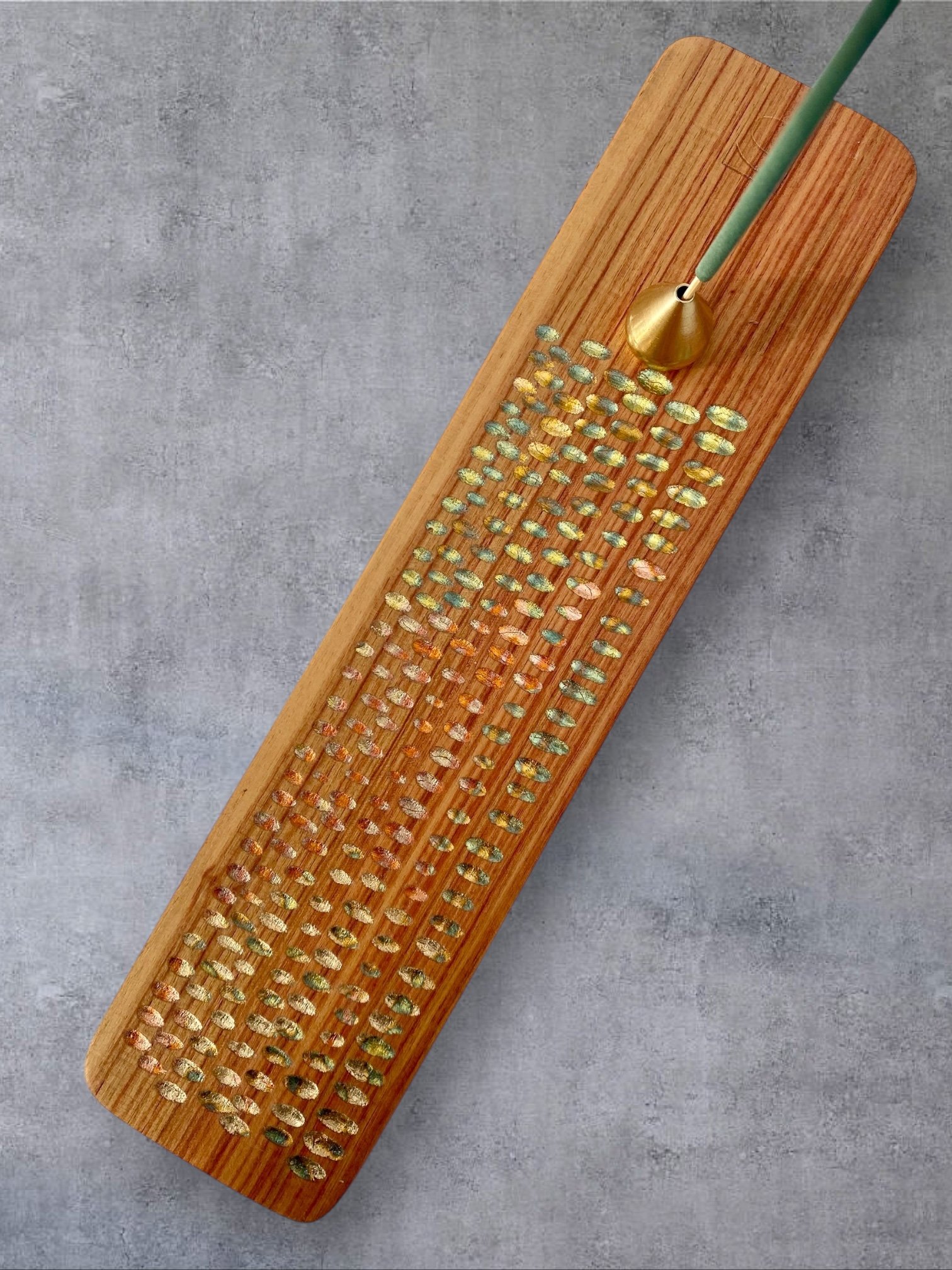 Sur chacun des porte-encens, je sculpte à la gouge des reliefs sobres et tactiles. Ces creux accueillent des feuilles de cuivre oxydées dont les teintes oscillent entre bleus profonds et rougeoiements moirés. Le métal, posé comme un fil de lumière dans le bois, capte le regard sans jamais l’éblouir. Ce jeu de matière n’est pas un effet : c’est une manière d’amener la lueur et la senteur au plus près de la main.