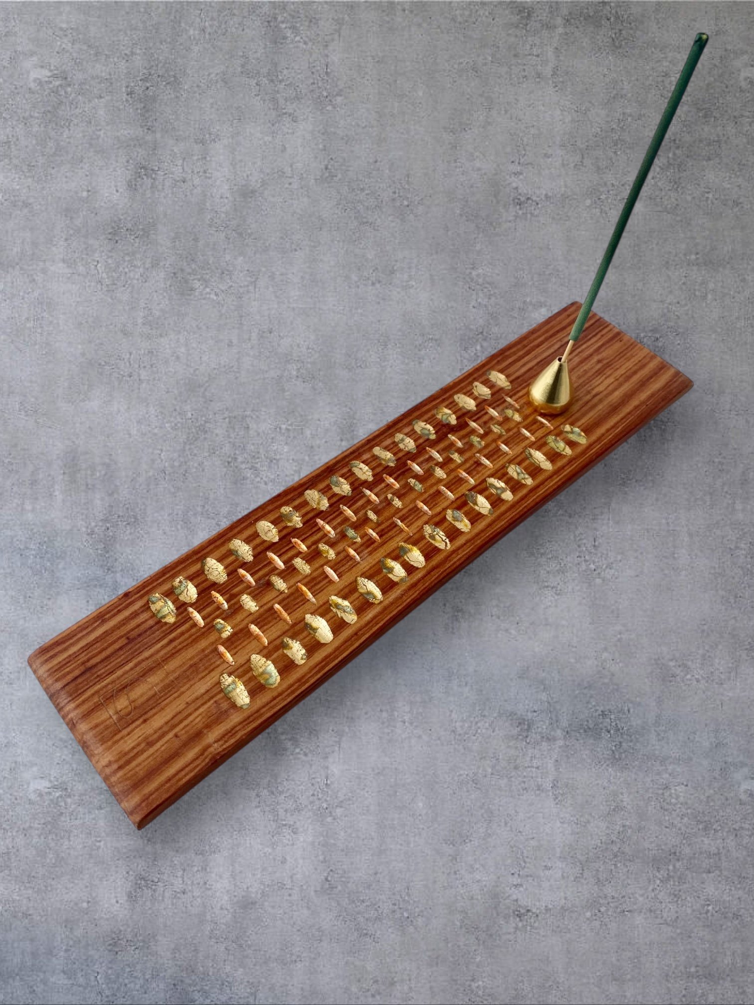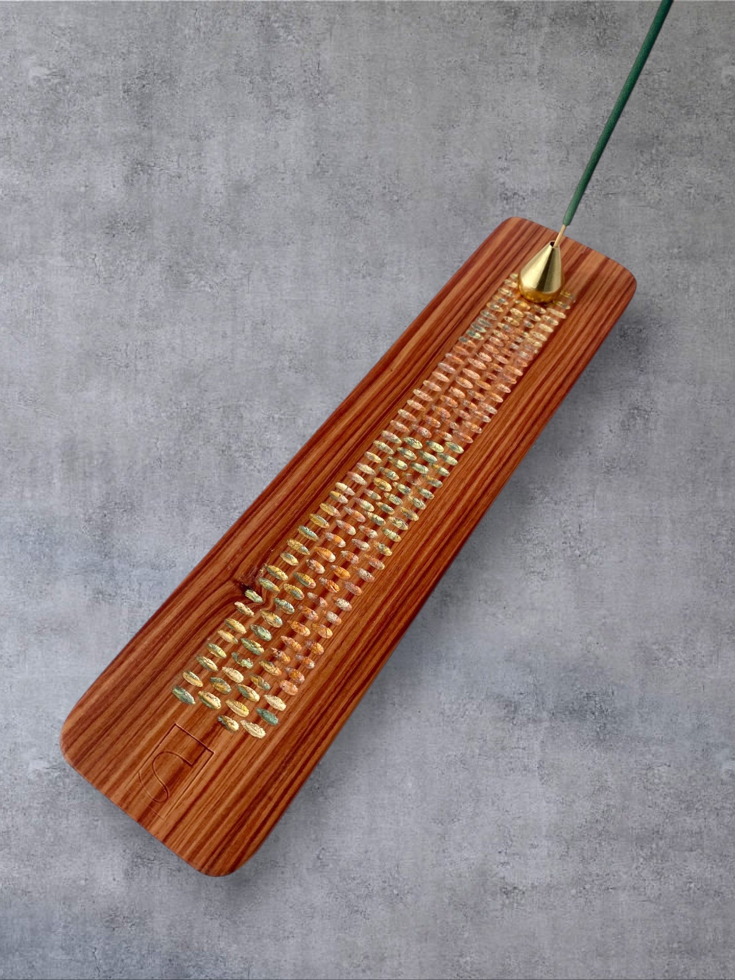 - La tige d’encens, tenue par un accessoire en laiton massif, pour un rayon parfumé qui s’élève et s’efface lentement.