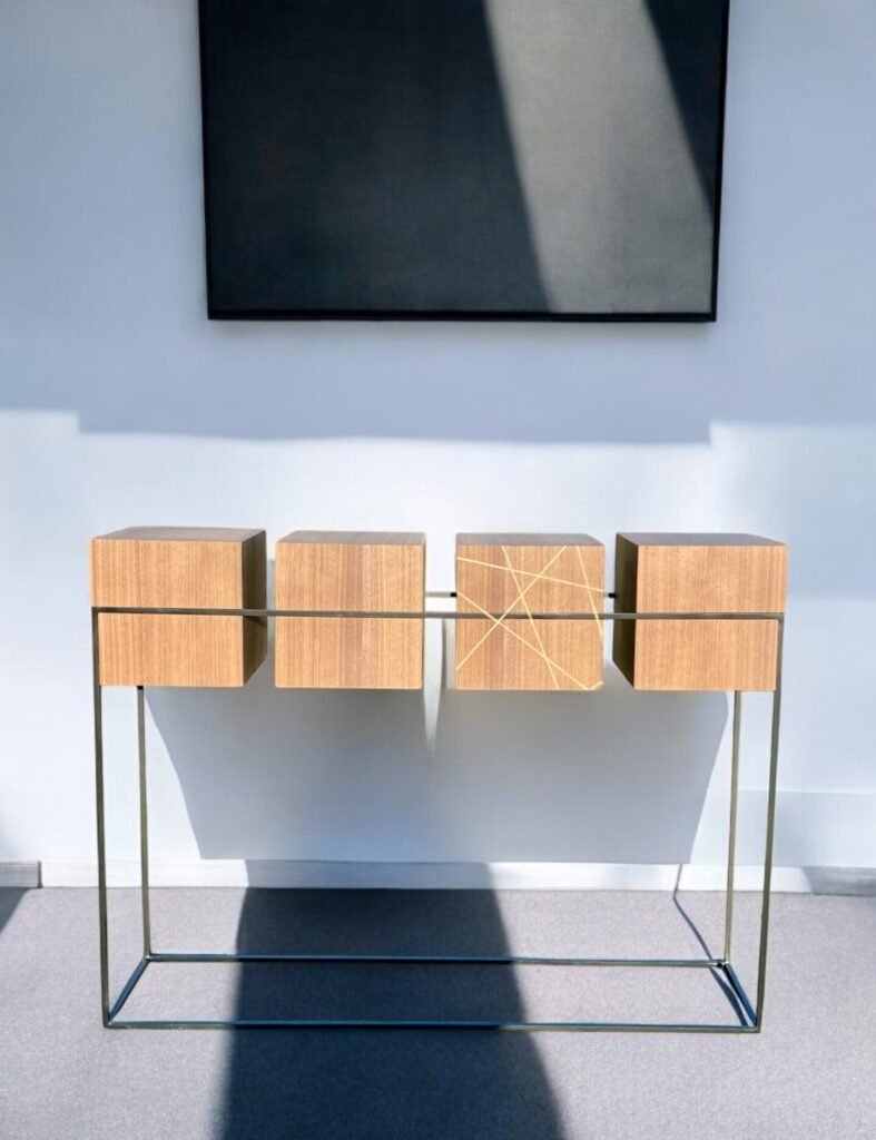 Afin de rendre cette console encore plus singulière, et de rompre la rigueur linéaire de ses quatre cubes, j’ai dessiné à la main de fines lignes dorées qui se prolongent et se rejoignent sur chacune des faces.