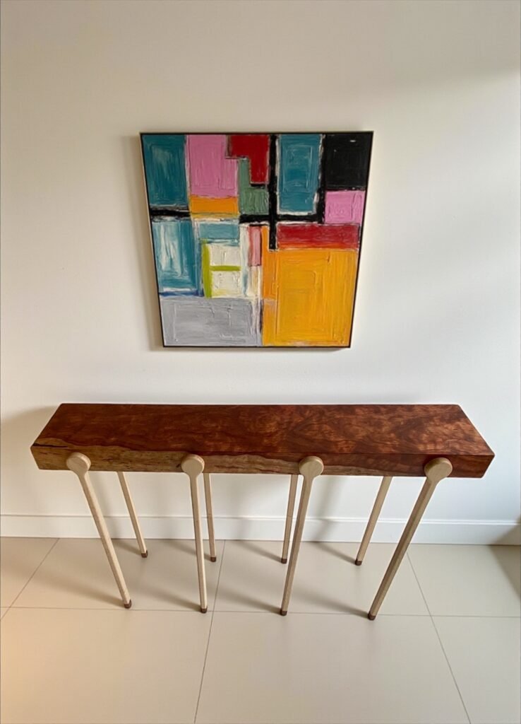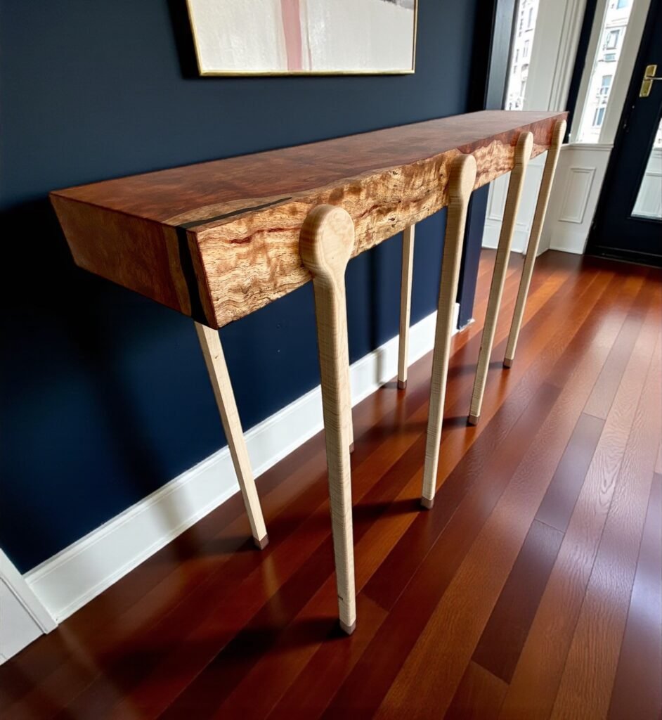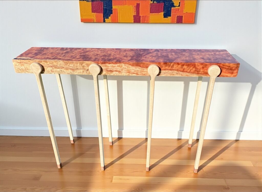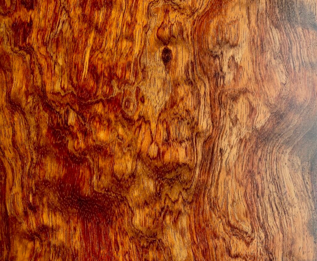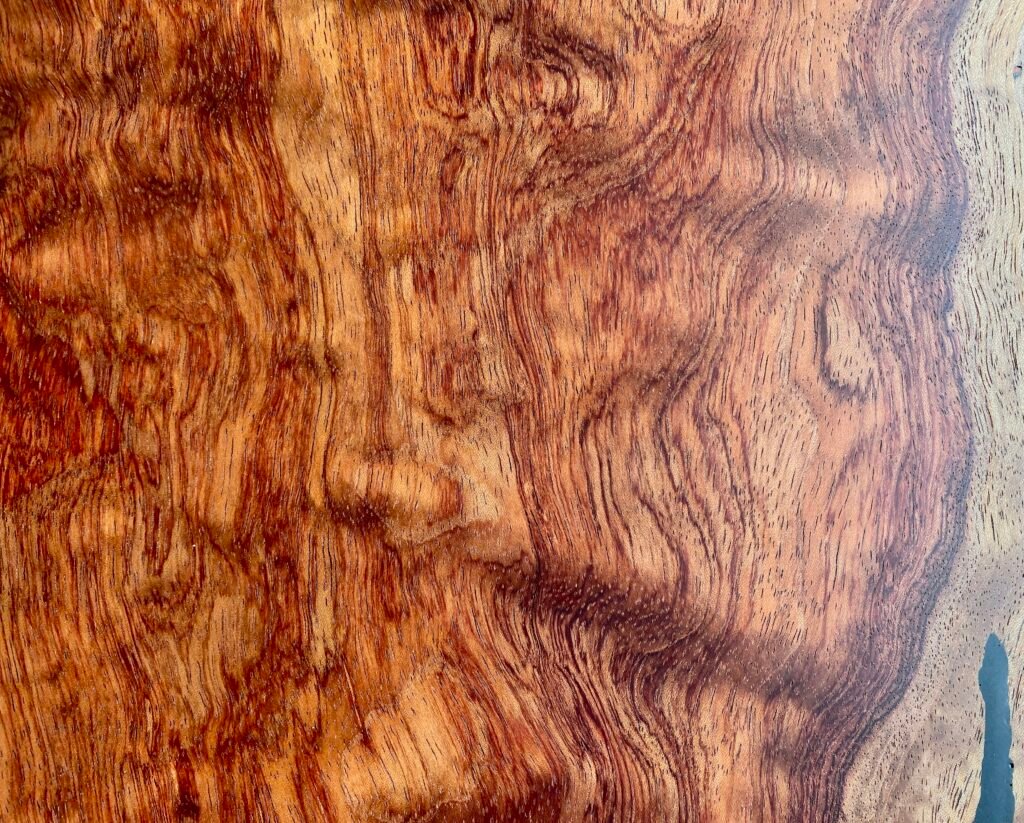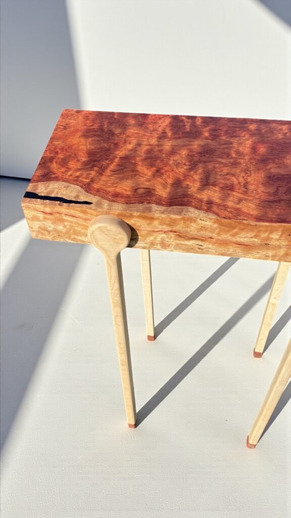 Pour accentuer le contraste des caractères, le piétement est réalisé en Sycomore ondé. Sa clarté nacrée répond au rouge profond du Buginga. Le grain ondulant du sycomore propose une contre-chant lumineux, presque musical, qui équilibrela densité sensuelle du plateau. L’une éclaire, l’autre embrase : deux bois qui se parlent sans se dominer.