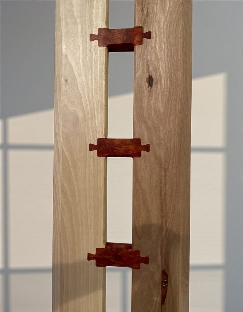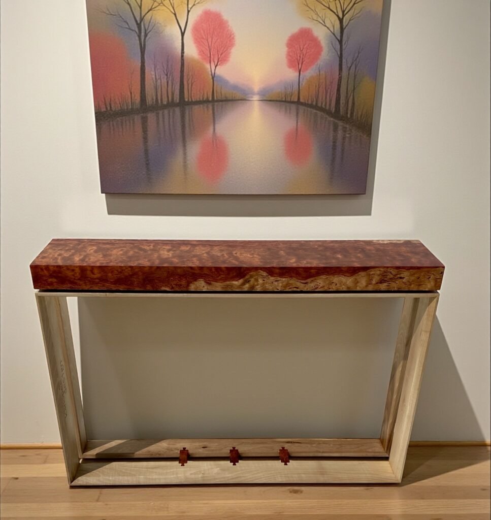 Je cherchais une présence plus dense, presque sculpturale. J’ai donc reconstitué l’épaisseur par des coupes d’onglet à 45°, en veillant à ce que le fil du bois se poursuive naturellement d’une face à l’autre. Le dessin enveloppe le plateau comme un ruban ; l’œil lit la continuité, la main sent l’unité.