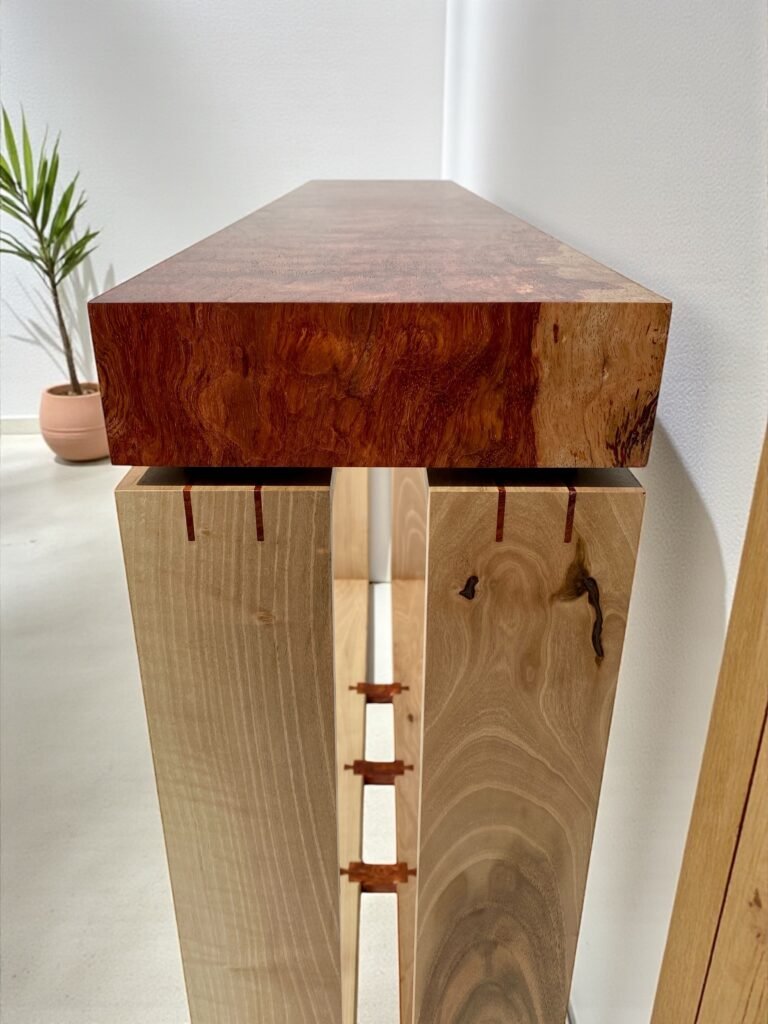 Pour alléger ce volume assumé, j’ai créé un interstice entre le plateau et le piétement. Ce simple espace produit l’essentiel : la console semble flotter. La lumière y circule, la silhouette gagne en légèreté, l’ensemble respire.