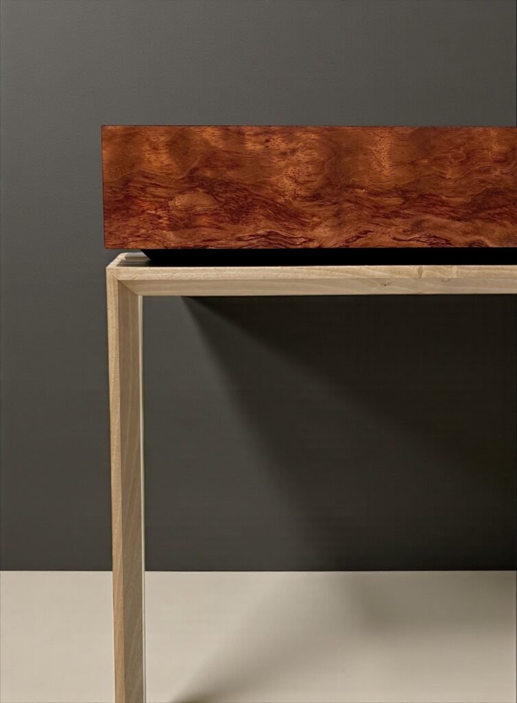 Comme on encadre un tableau, j’ai imaginé un piétement en forme de cadre, avec des chants biseautés à angle fermé. Deux cadres jumeaux, reliés par de discrètes entretoises en tête et en pied, assurent rigidité et précision. Le choix d’un noyer non étuvé apporte une clarté douce qui équilibre la profondeur cuivrée du Bubinga.