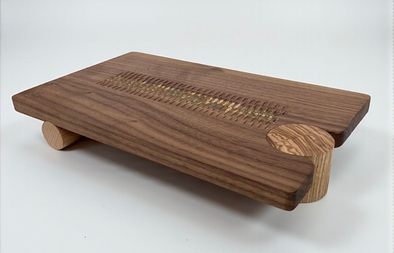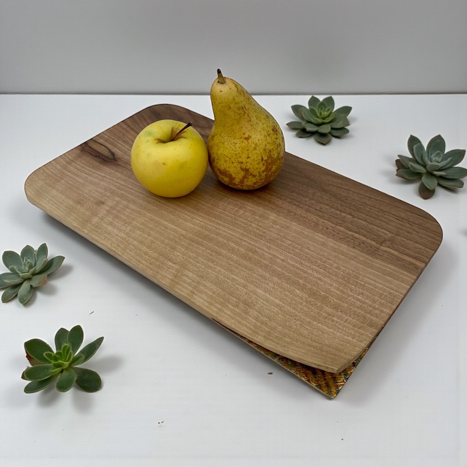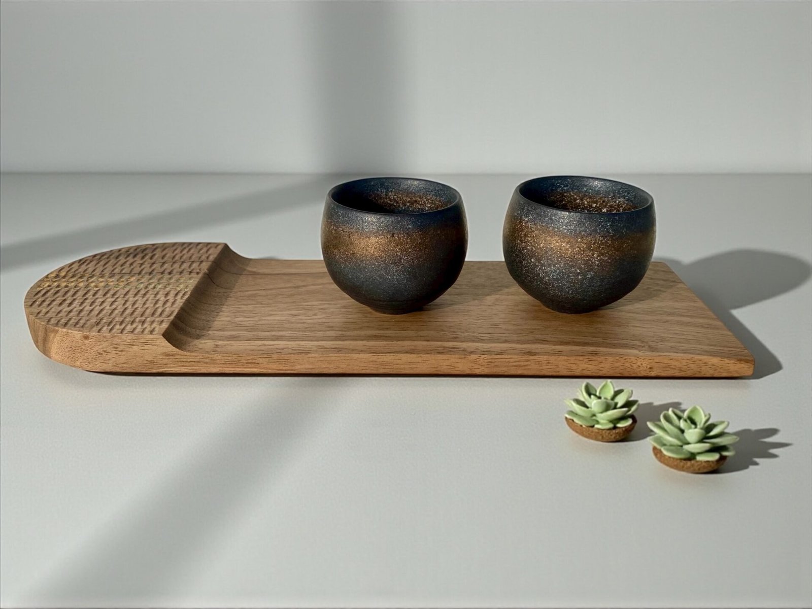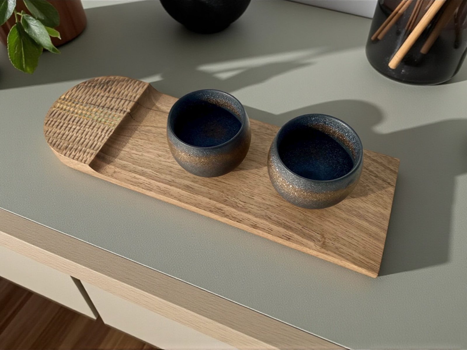 Côté décoration, les plateaux se déclinent en formats variés, du service café au centre de table. Les surfaces sont parfois sculptées à la gouge, laissant apparaître des textures singulières qui accrochent la lumière. Certains modèles s’ornent d’une dorure à la feuille : des feuilles de cuivre oxydées tracent comme un « chemin de table » délicat, apportant une note graphique et chaleureuse. Chaque pièce est soigneusement finie pour un usage quotidien, entre praticité et élégance.