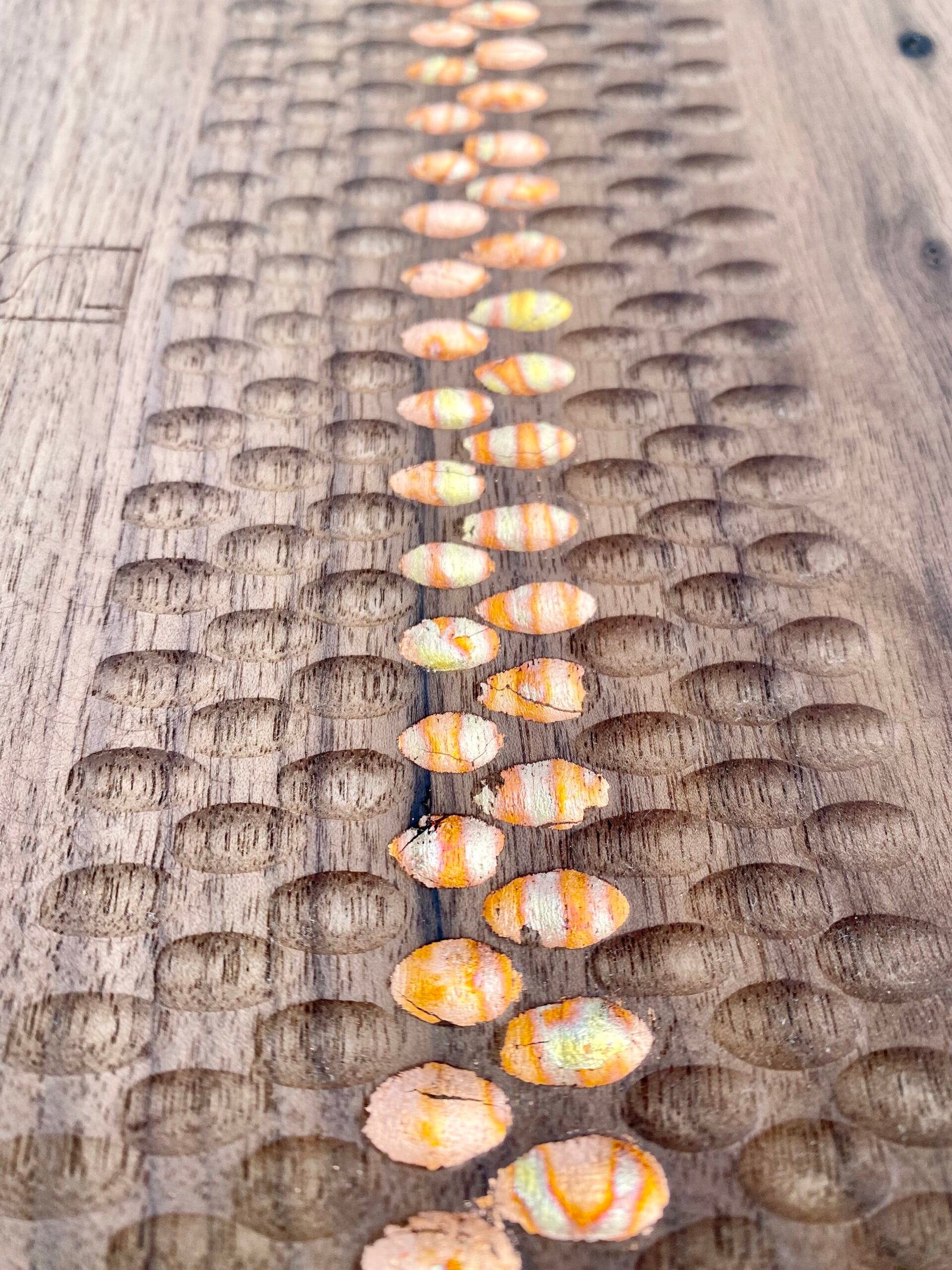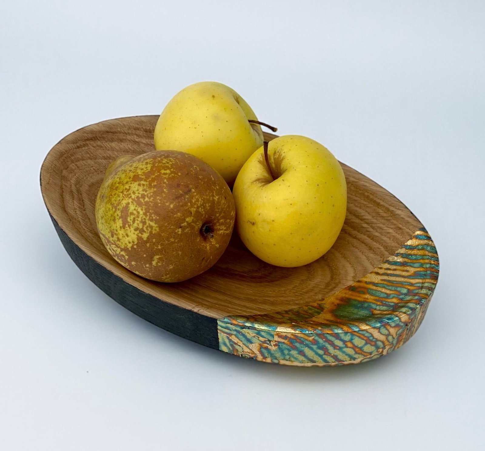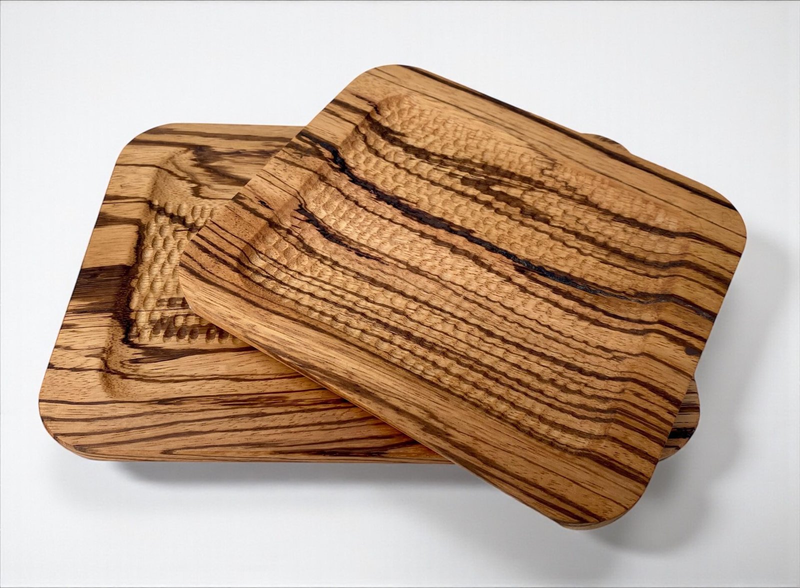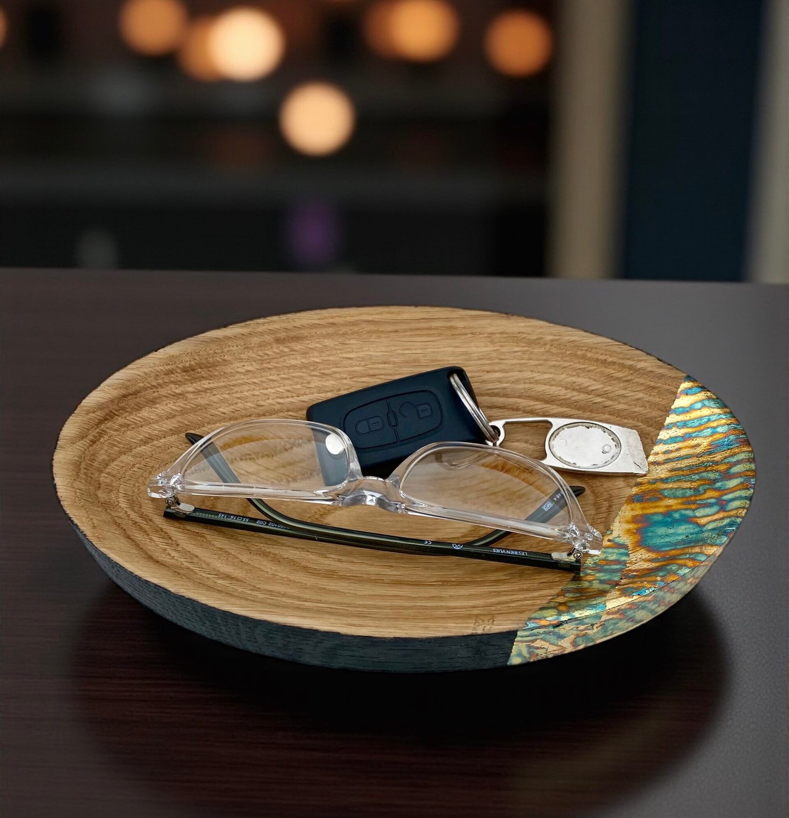 Côté décoration, les plateaux se déclinent en formats variés, du service café au centre de table. Les surfaces sont parfois sculptées à la gouge, laissant apparaître des textures singulières qui accrochent la lumière. Certains modèles s’ornent d’une dorure à la feuille : des feuilles de cuivre oxydées tracent comme un « chemin de table » délicat, apportant une note graphique et chaleureuse. Chaque pièce est soigneusement finie pour un usage quotidien, entre praticité et élégance.