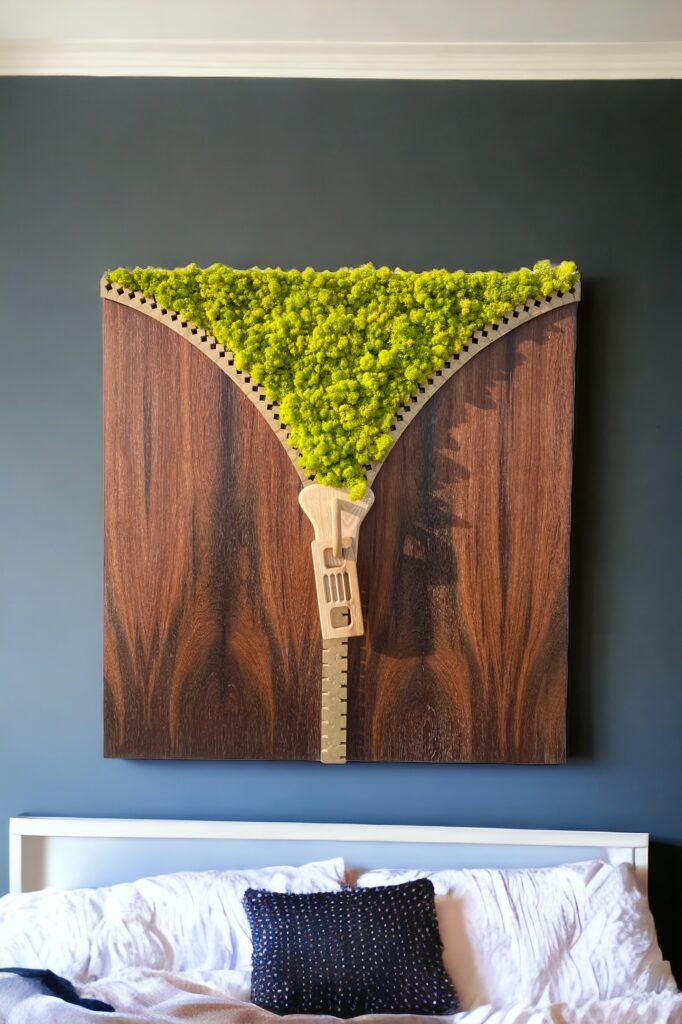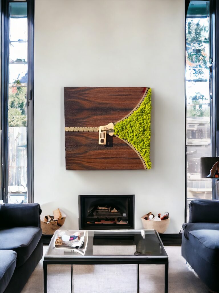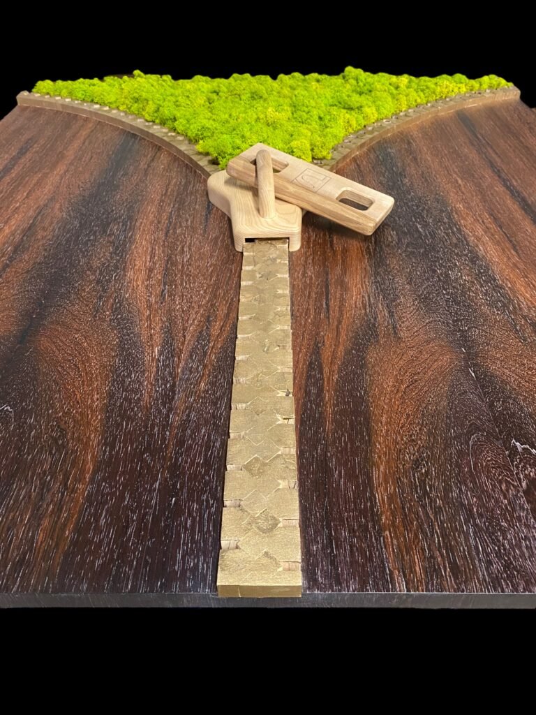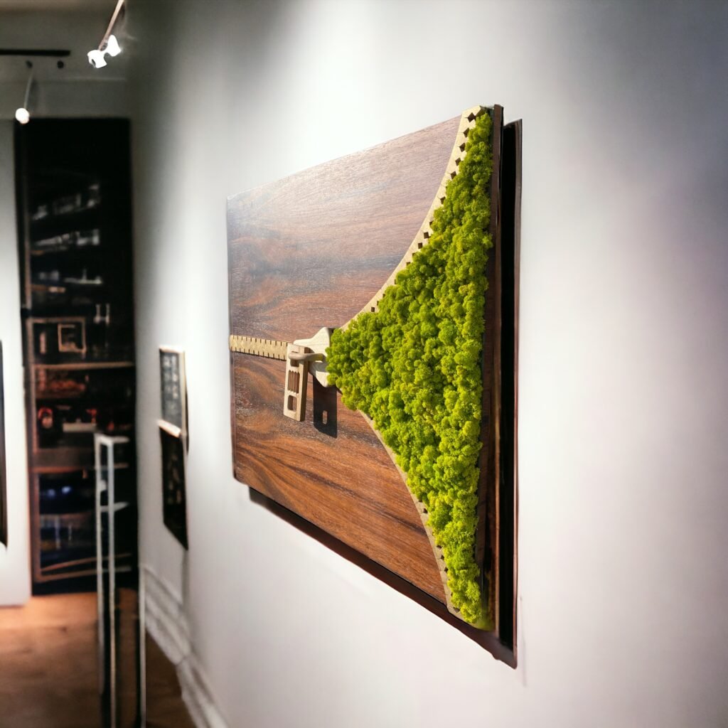 À travers la fermeture éclair sculptée, on découvre une surface de lichen stabilisé, un végétal naturel qui garde son aspect sans entretien, ni lumière, ni eau. Ce mélange de bois et de végétal donne à la pièce un caractère vivant, presque apaisant.