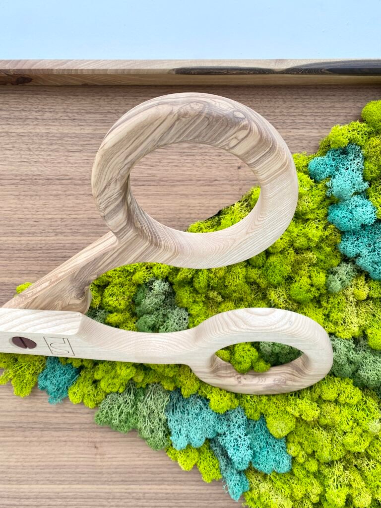 Ainsi, ces ciseaux en bois semblent découper… du bois, pour révéler une forêt miniature de lichen. Ce contraste entre artifice et nature invite à réfléchir sur notre perception des objets et du monde qui nous entoure.