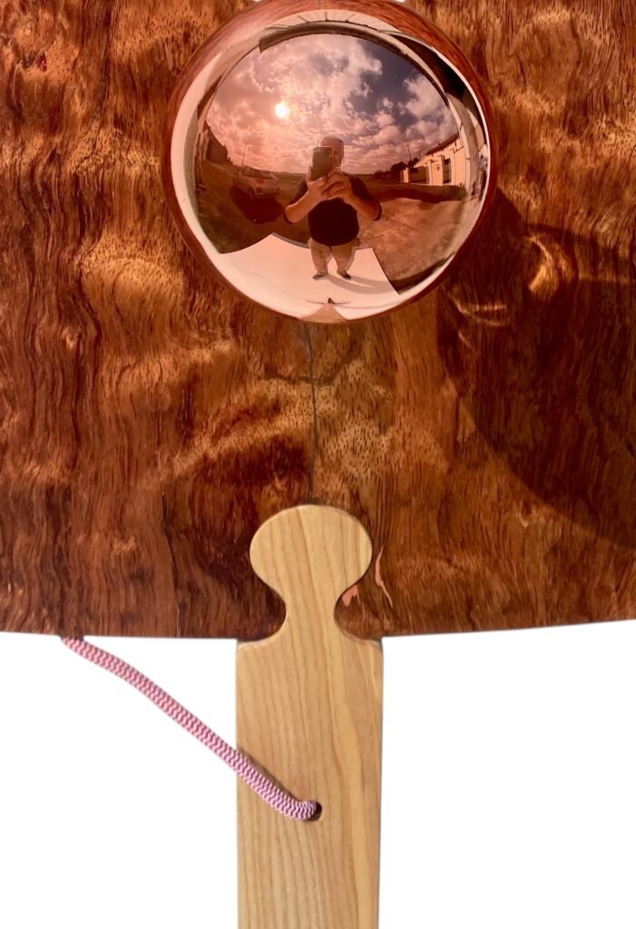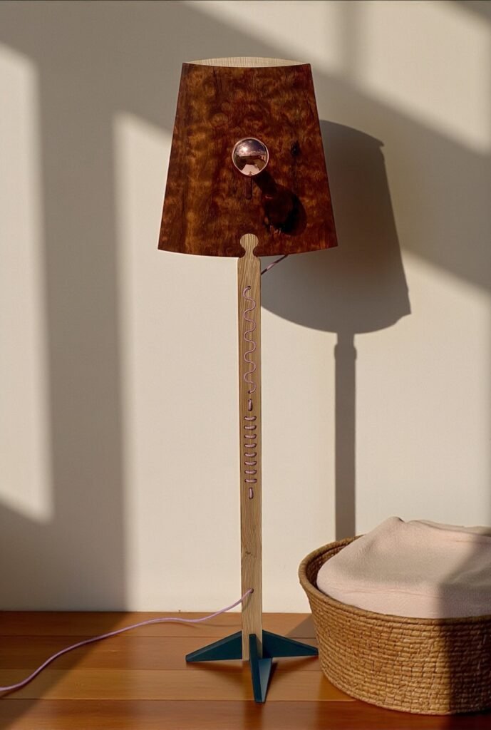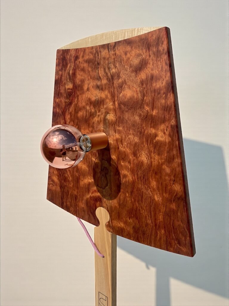 Face à l’abat-jour, la question s’invite d’elle-même : suis-je devant une forme en volume, ou devant son icône ? La ligne est claire, le contour s’affirme, et dans cette tension 2D/3D la lumière trouve sa place. L’abat-jour est façonné dans une essence exotique dont le veinage cuivré s’anime sous l’éclairage ; il vibre, respire, et rappelle que la matière porte déjà son propre soleil.