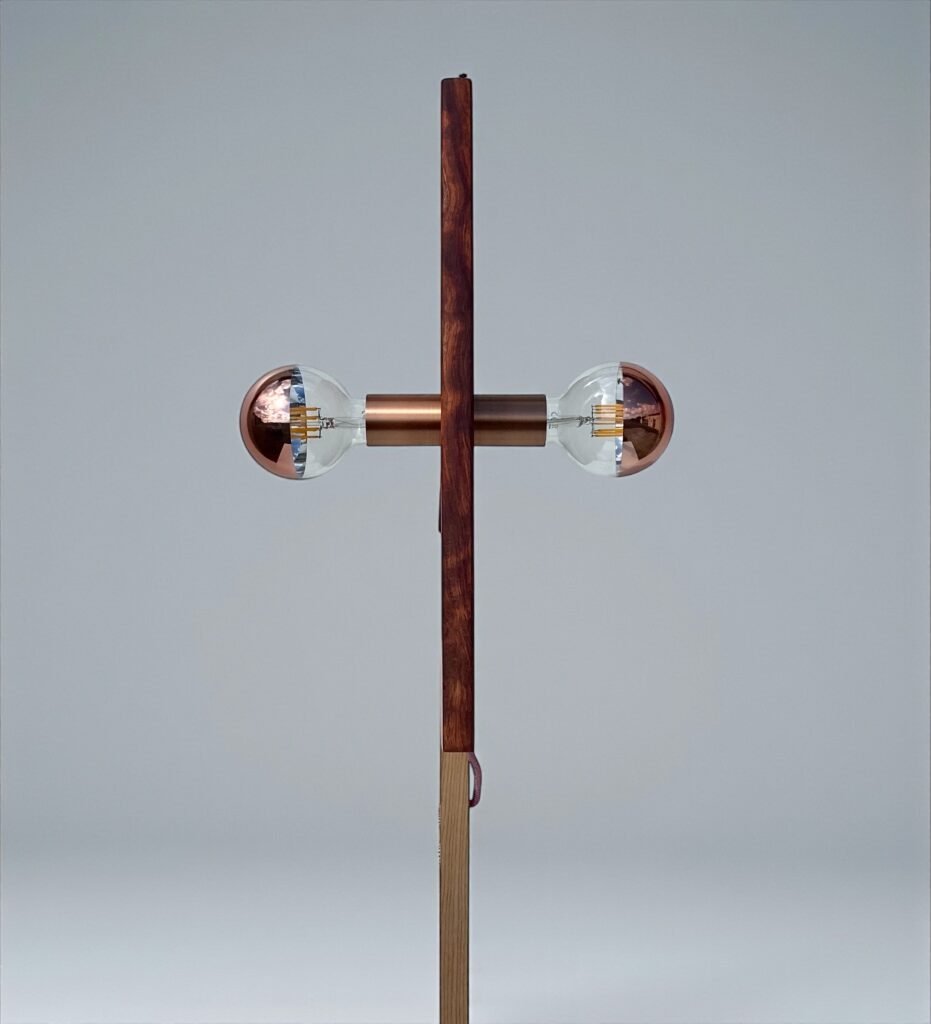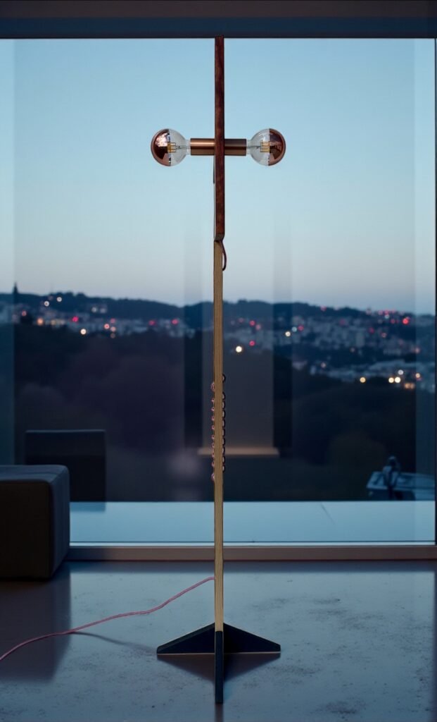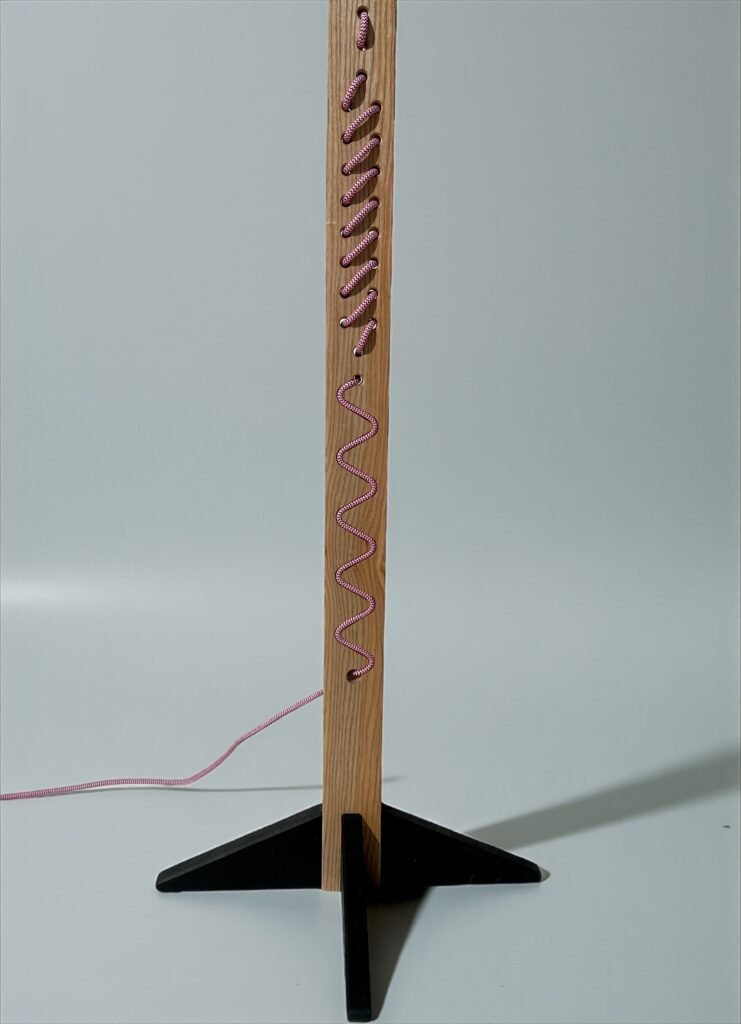 Le pied, en frêne et hêtre teinté noir, sert de contrepoint. Sa présence est fine, stable, précise ; il met à distance la tentation du décoratif inutile pour mieux révéler le dialogue des plans. La lumière, portée par deux ampoules, reste ample mais non agressive : elle éclaire largement sans jaillir au visage, installe une ambiance de salon, accompagne une lecture, nuance une fin de journée.