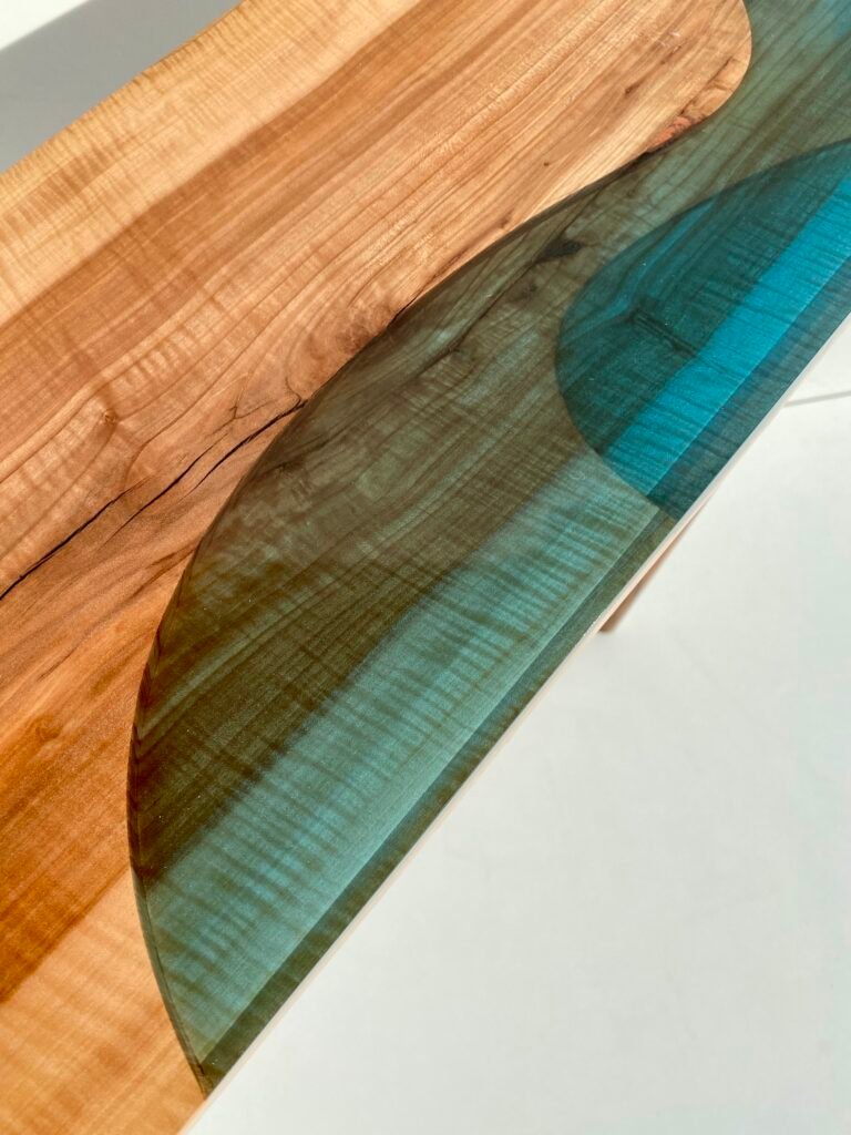 J’ai dessiné puis sculpté, à chaque extrémité du plateau, des lagunes imaginaires aux courbes douces. Pour parachever l’illusion, une résine époxy bleue, coulée en transparence, joue avec la lumière et révèle les veinures du poirier. Les reflets varient selon l’heure du jour : au matin, la surface pâlit comme une eau laiteuse ; au zénith, elle s’embrase ; le soir, elle s’assombrit et gagne en profondeur. La pièce devient un petit paysage : un rivage privé, toujours changeant.