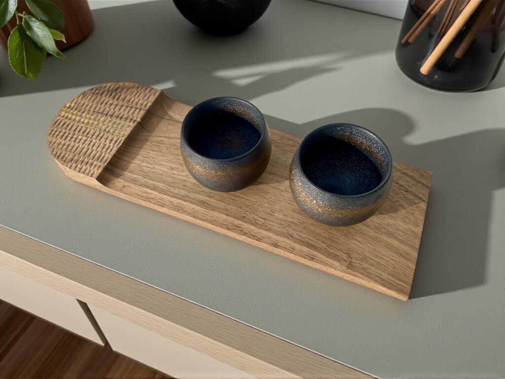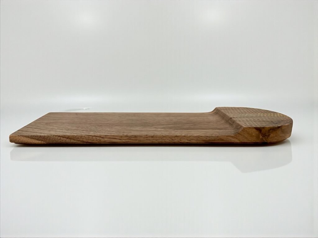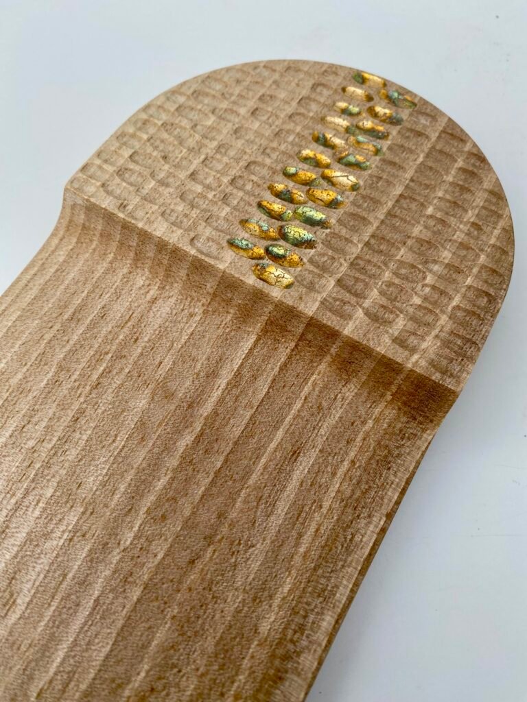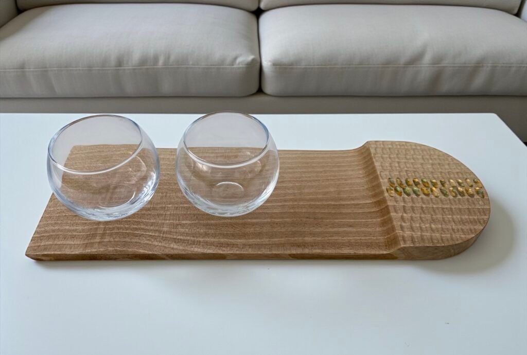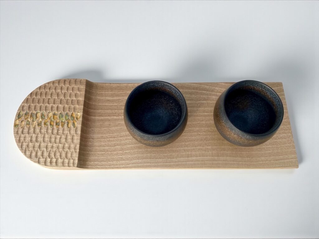 Ce petit plateau de service à café s’inscrit dans cet esprit. J’ai imaginé une ligne volontairement simple, mais pas minimaliste au point d’en devenir fade. Pour préserver sa personnalité, j’ai choisi d’en affiner la forme en retirant une partie de la matière. Le plateau gagne alors en légèreté et en élégance, tandis qu’une extrémité, plus épaisse, accueille une sculpture réalisée à la gouge.