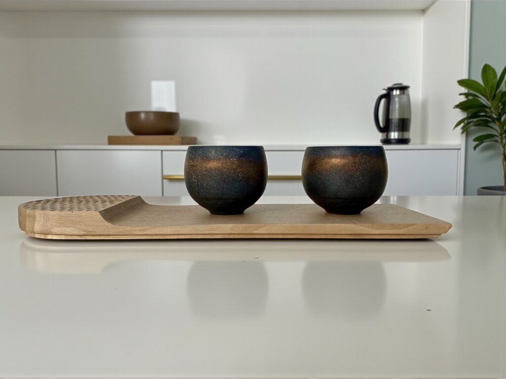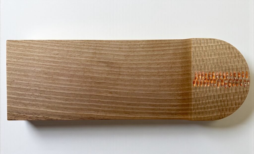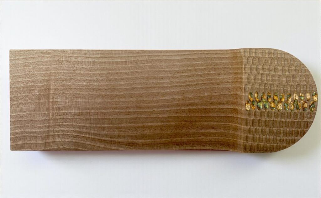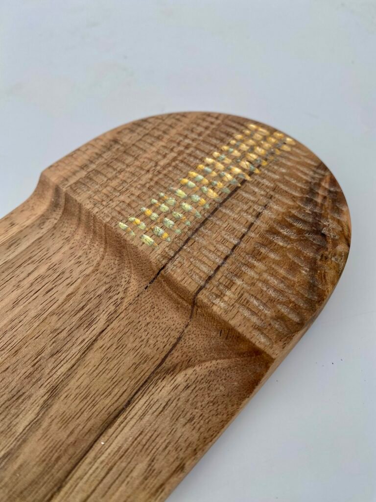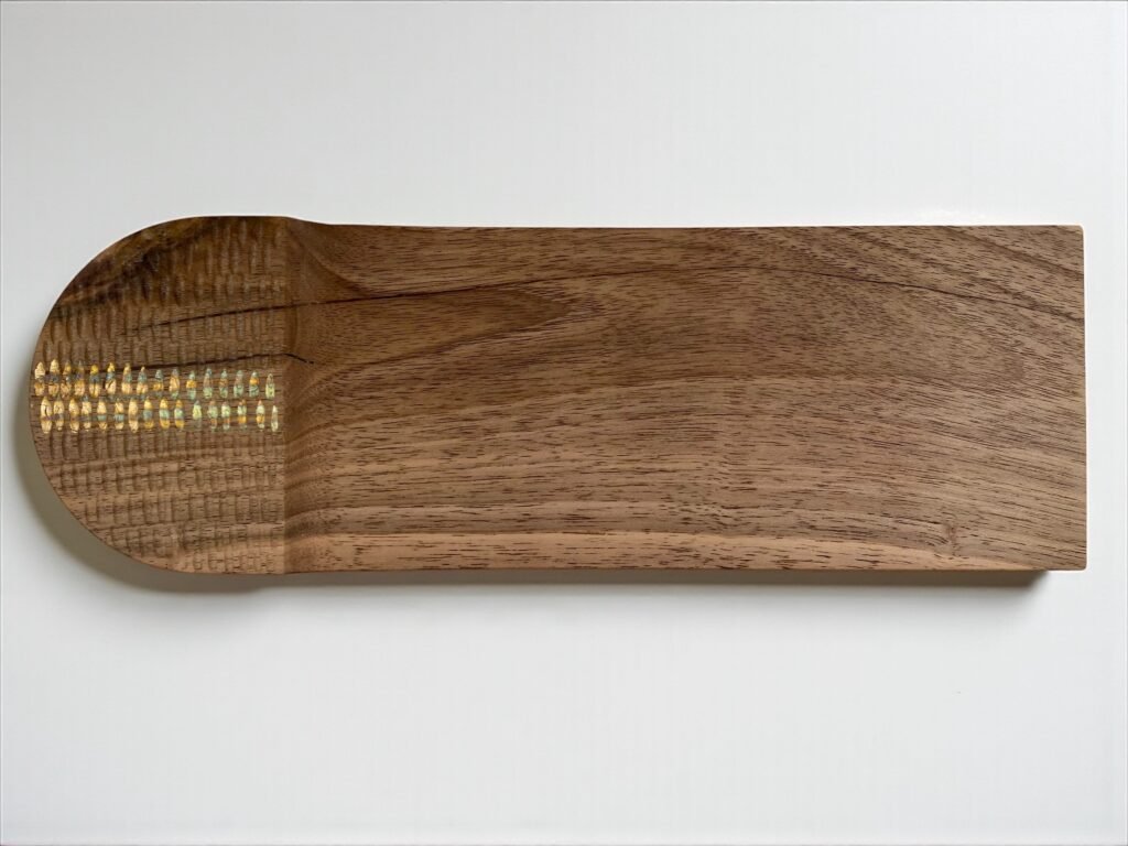 Ce petit plateau de service à café s’inscrit dans cet esprit. J’ai imaginé une ligne volontairement simple, mais pas minimaliste au point d’en devenir fade. Pour préserver sa personnalité, j’ai choisi d’en affiner la forme en retirant une partie de la matière. Le plateau gagne alors en légèreté et en élégance, tandis qu’une extrémité, plus épaisse, accueille une sculpture réalisée à la gouge.