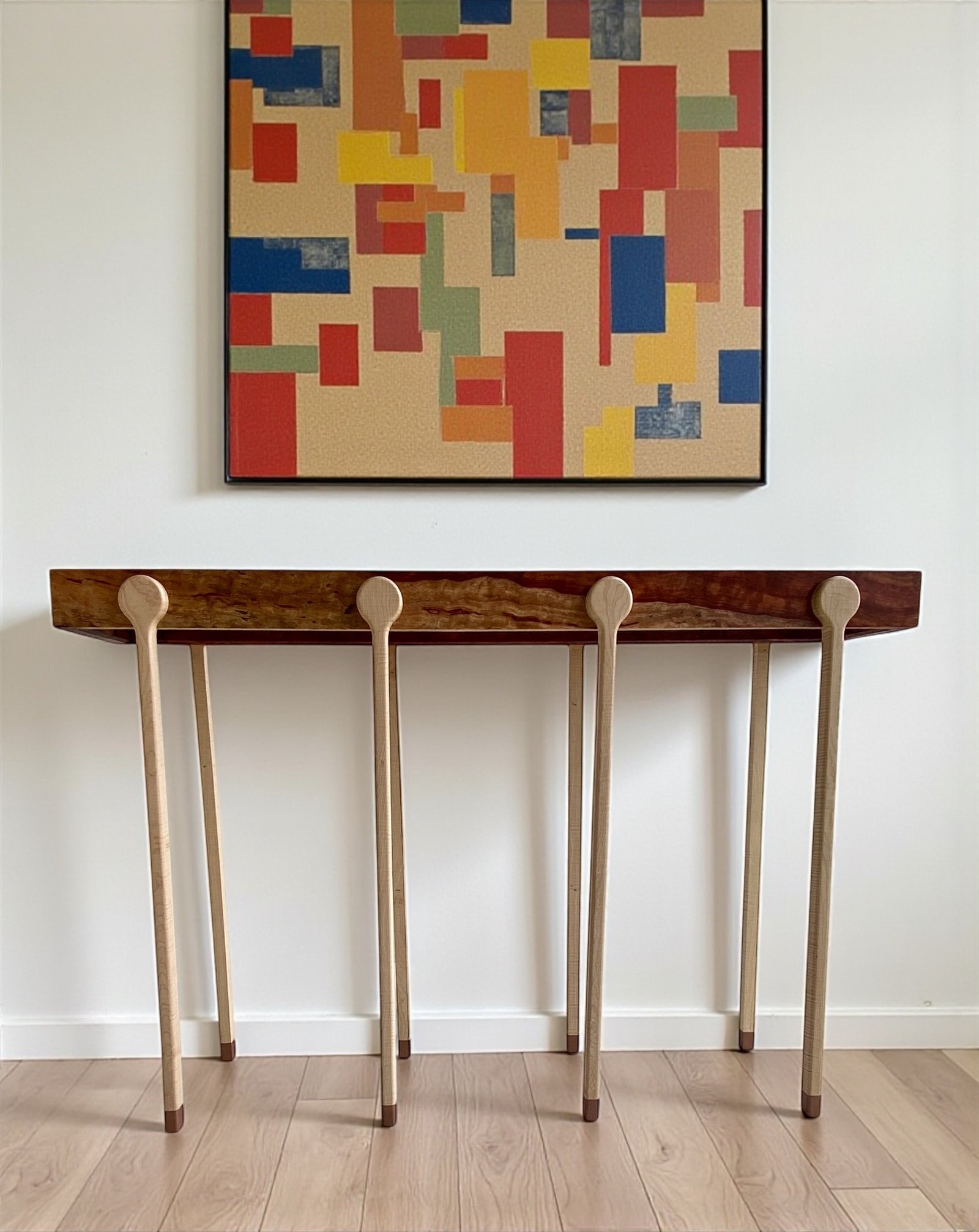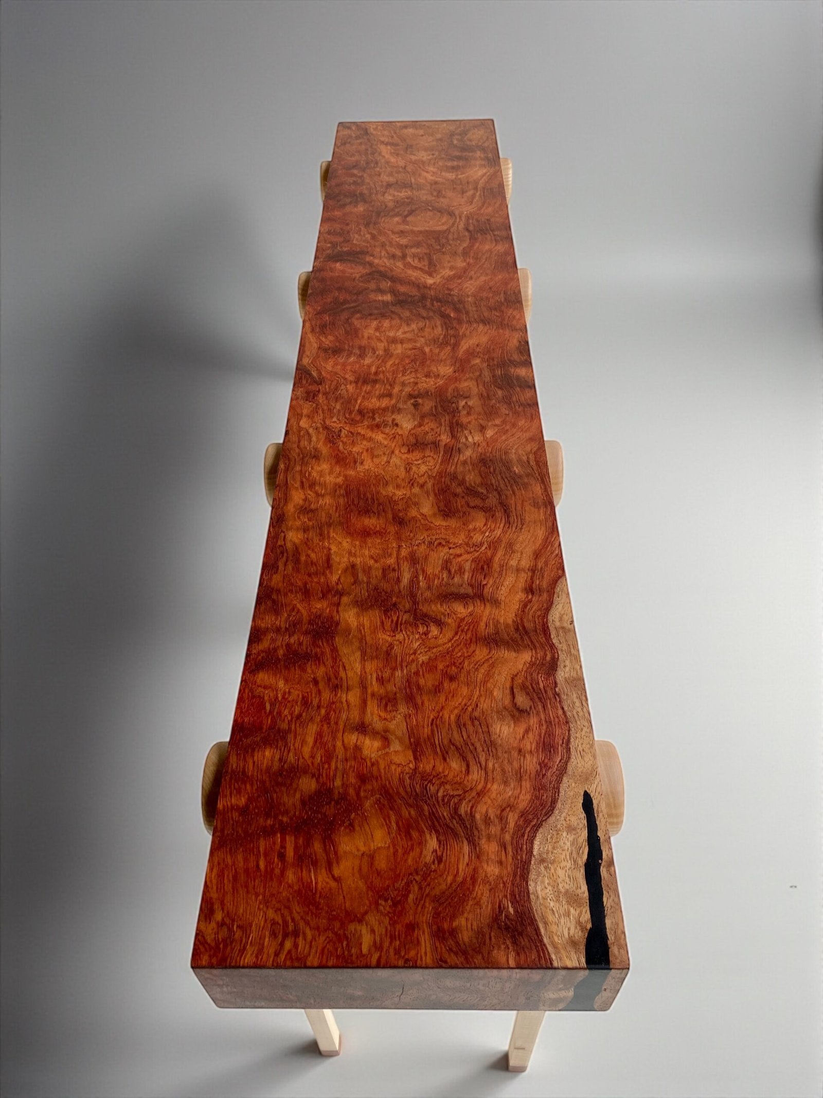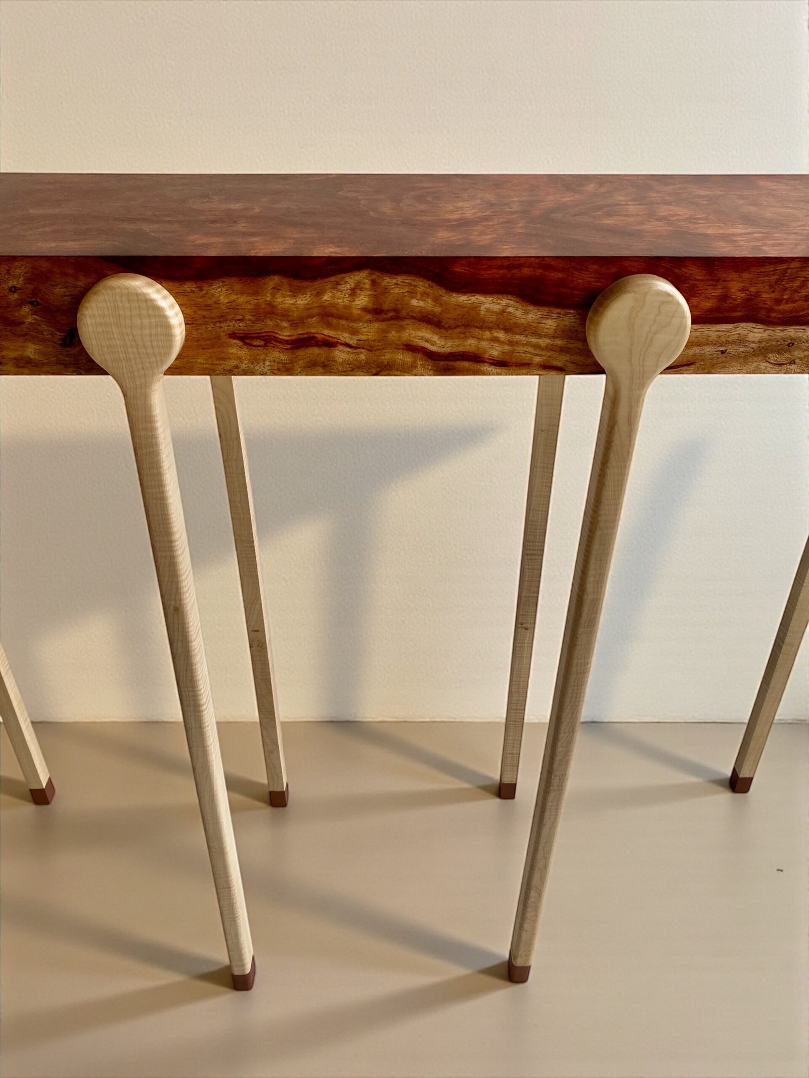 Pour le piétement, j’ai choisi un Sycomore ondé clair, lumineux. Ses ondes nacrées répondent au rouge profond du plateau, comme un contre-chant équilibré. Deux essences qui se répondent sans jamais se dominer.