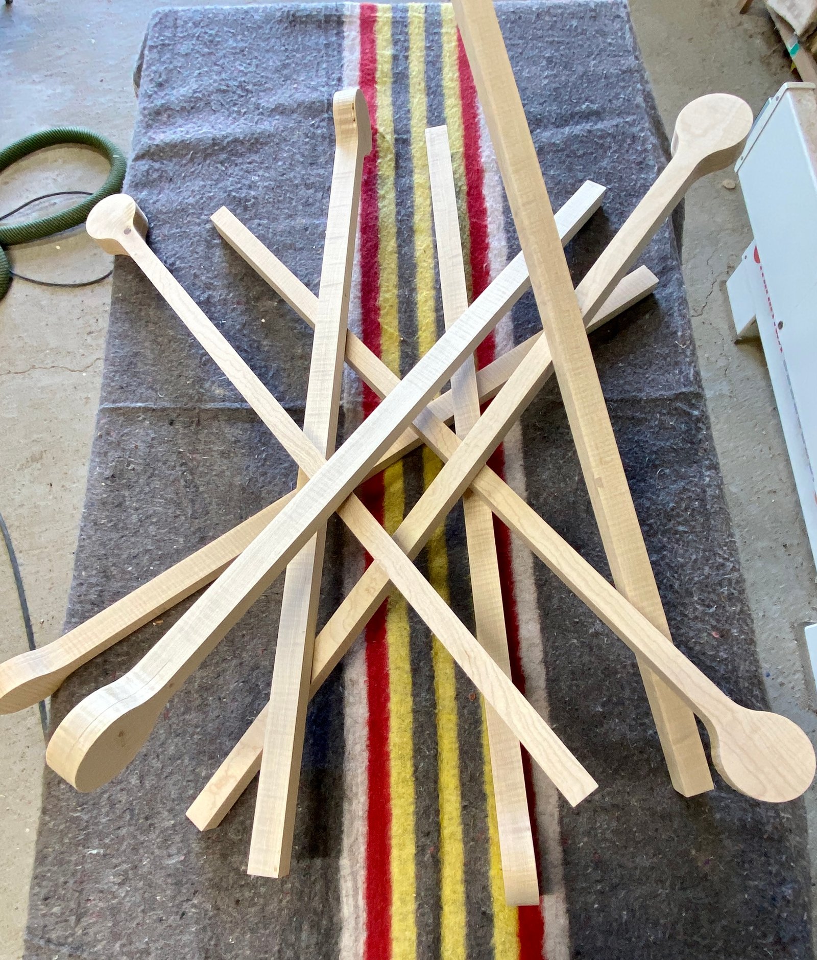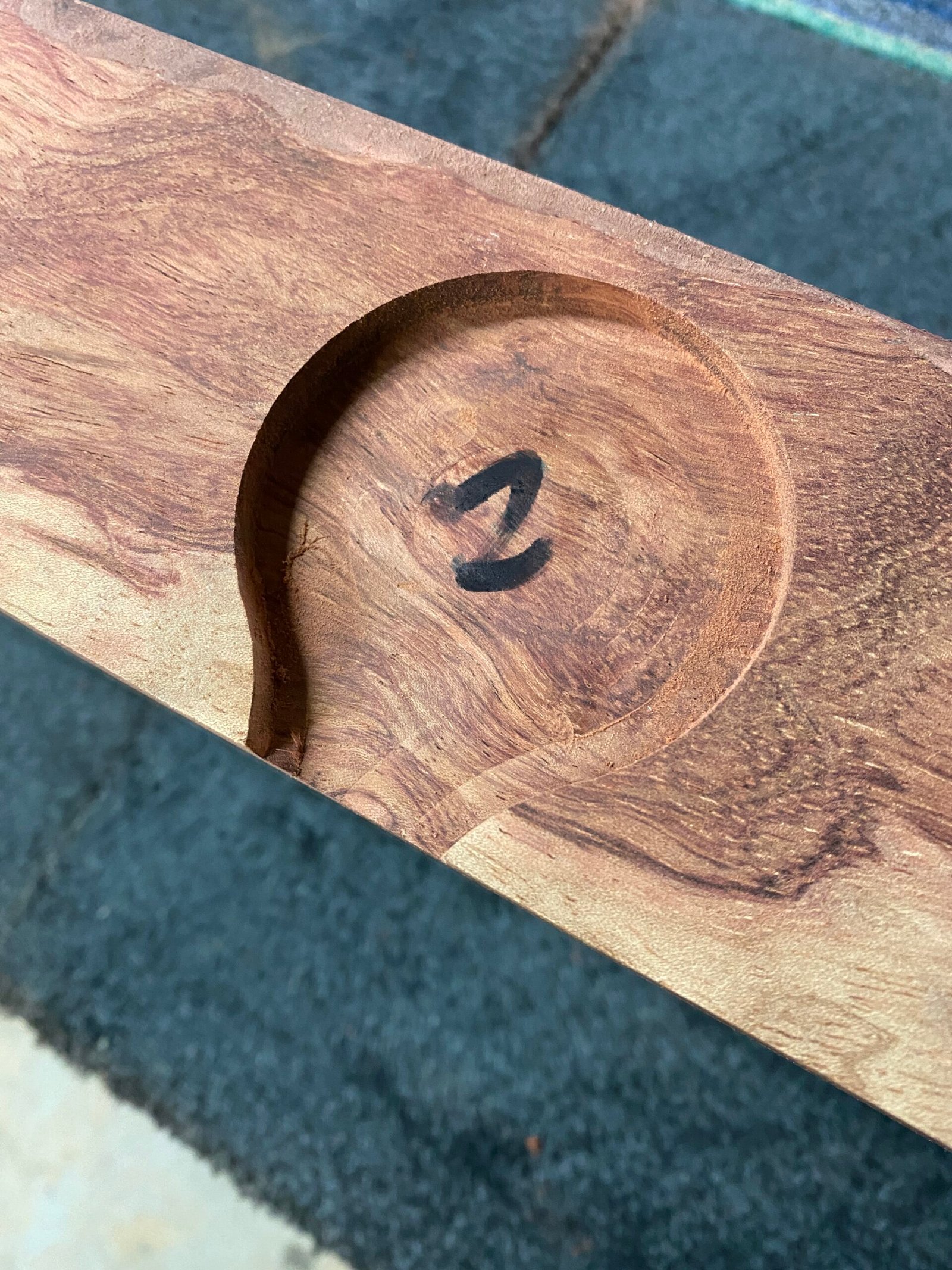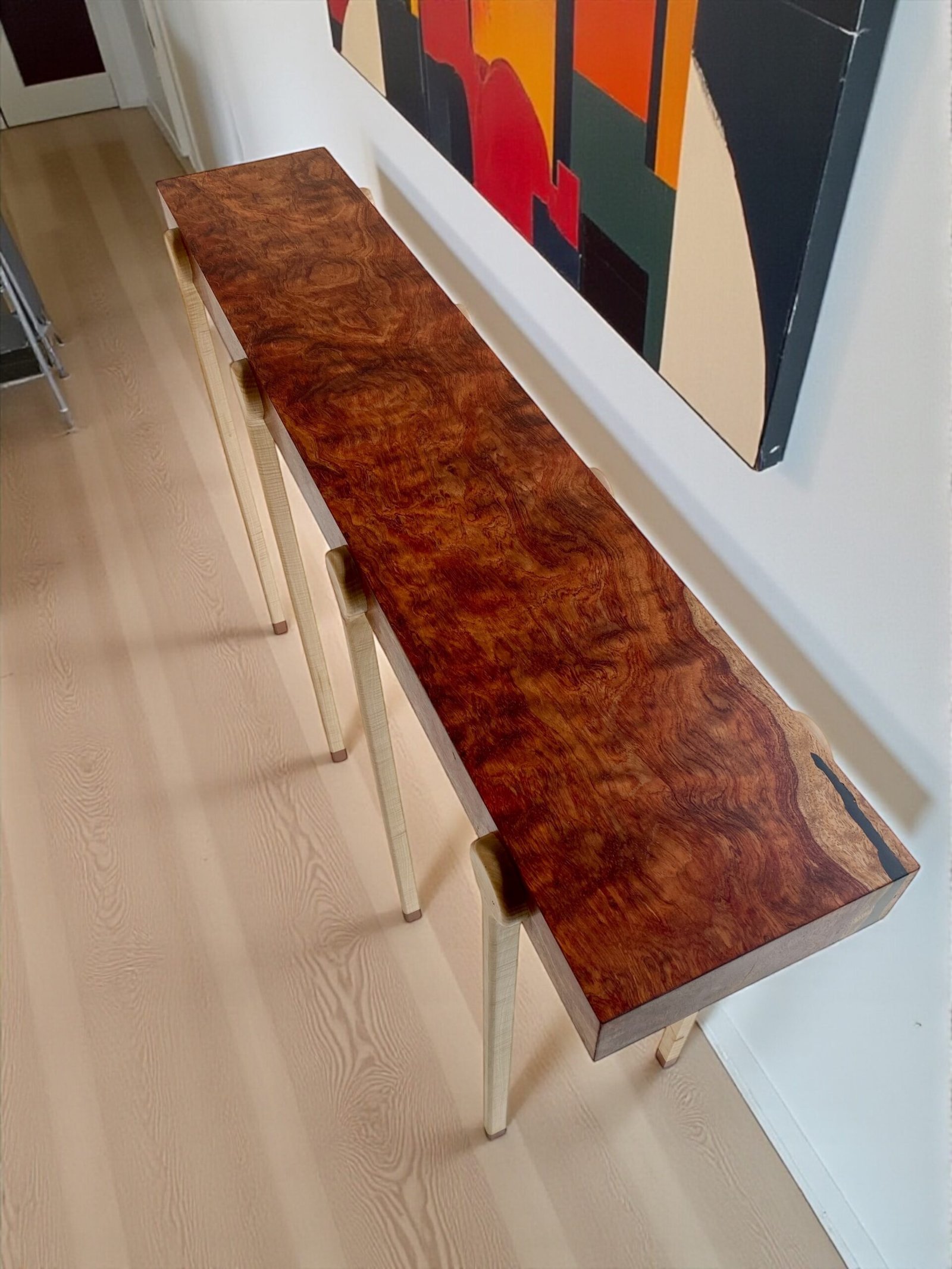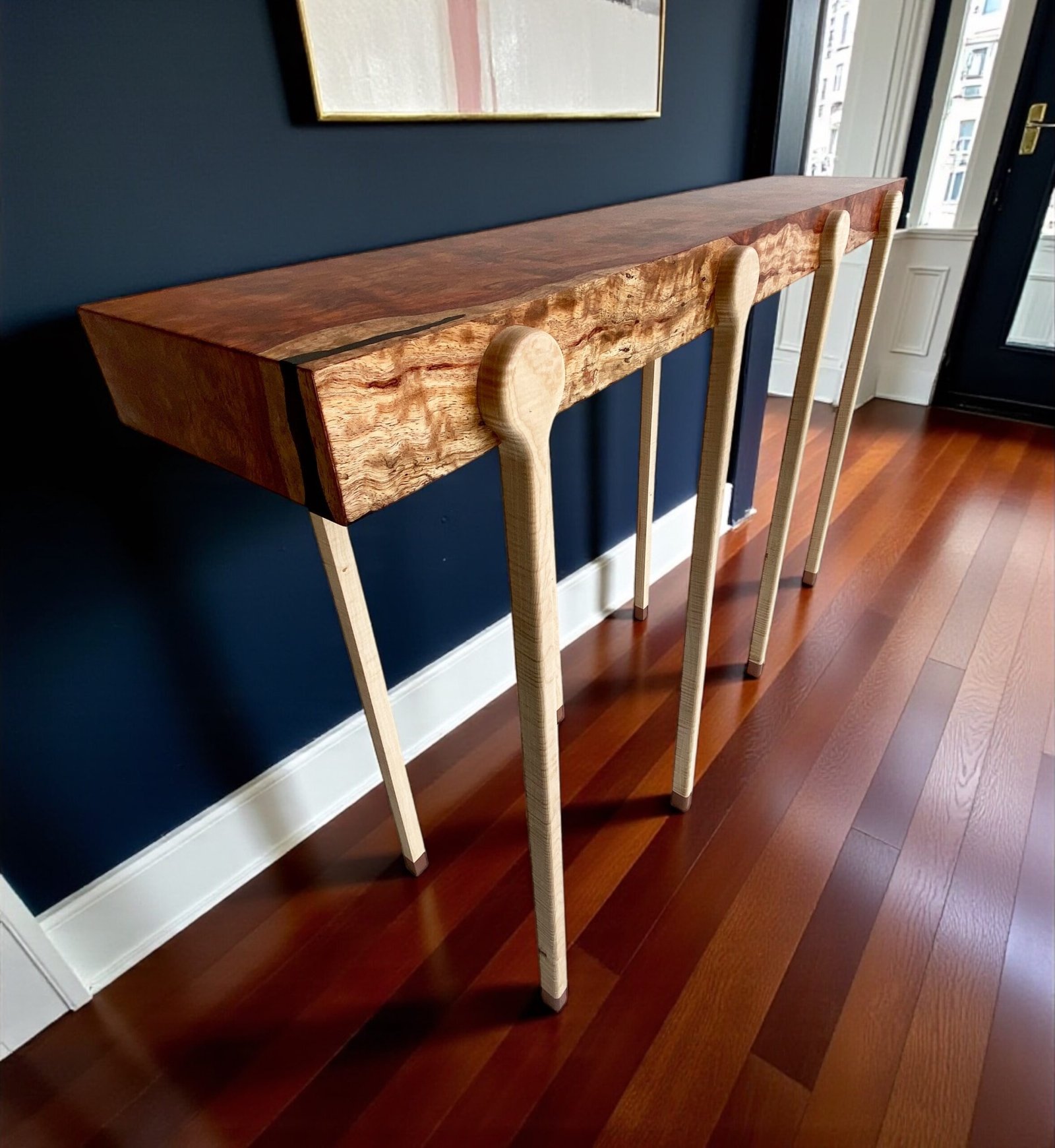 Pour le piétement, j’ai choisi un Sycomore ondé clair, lumineux. Ses ondes nacrées répondent au rouge profond du plateau, comme un contre-chant équilibré. Deux essences qui se répondent sans jamais se dominer.