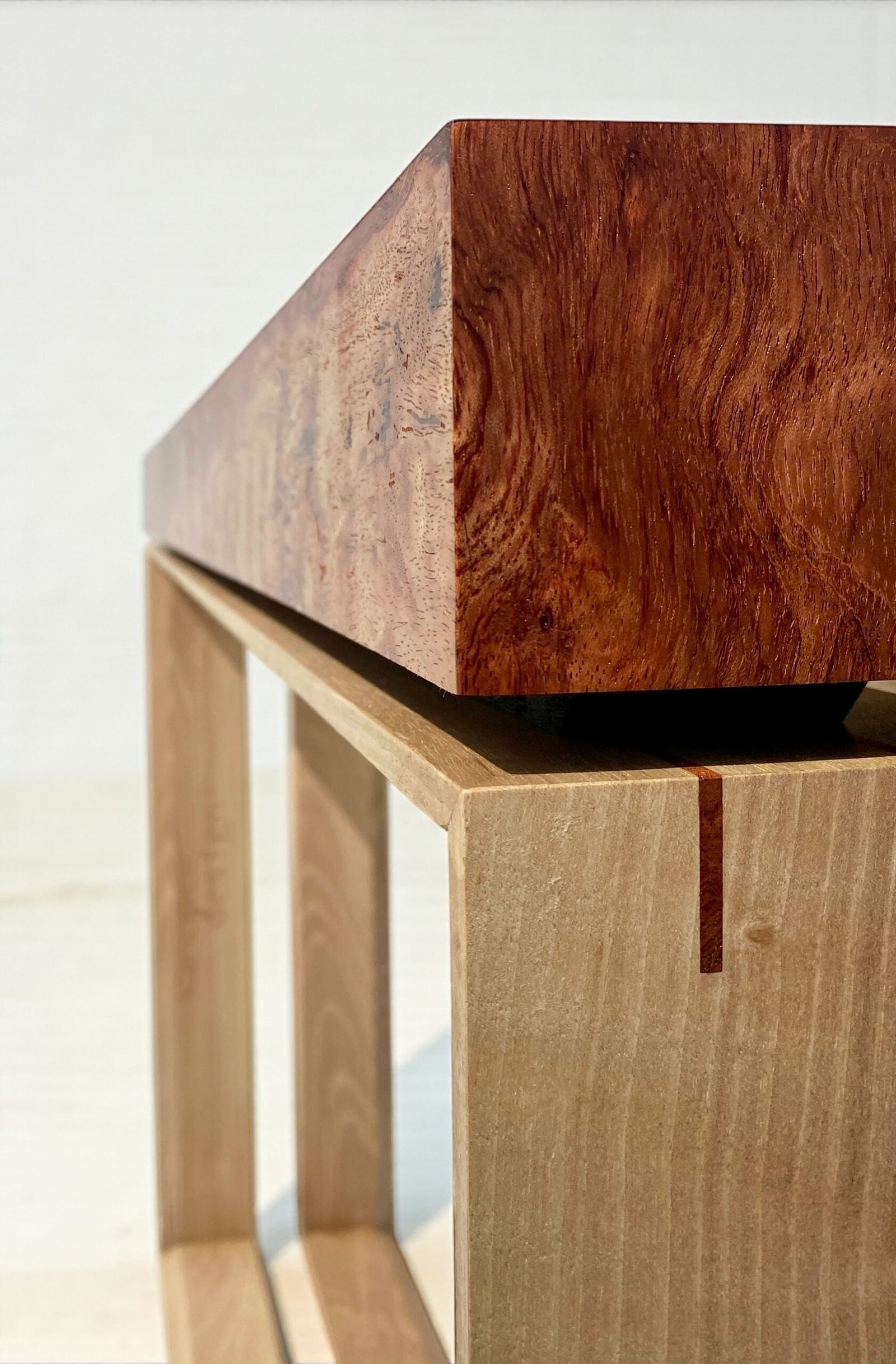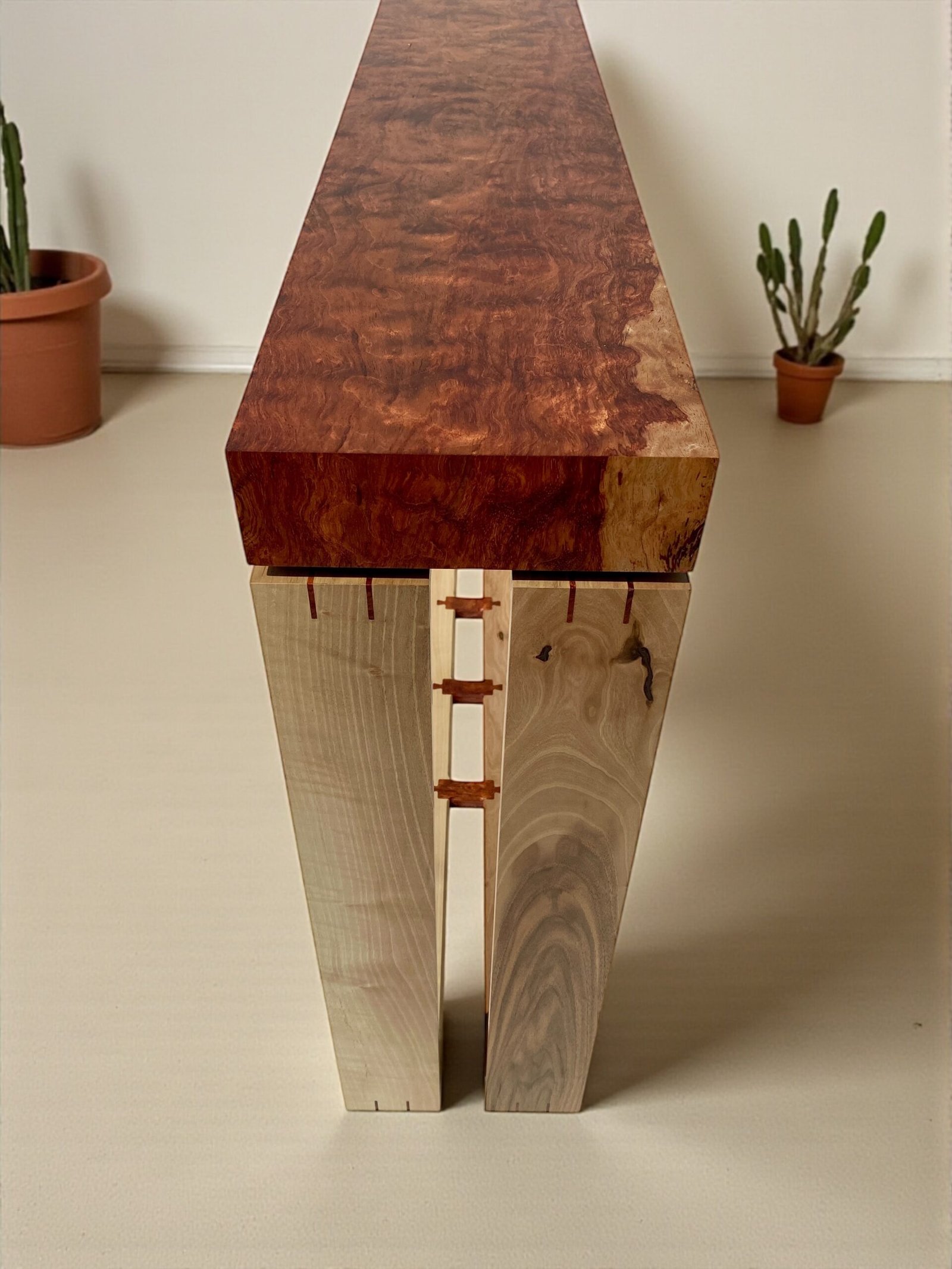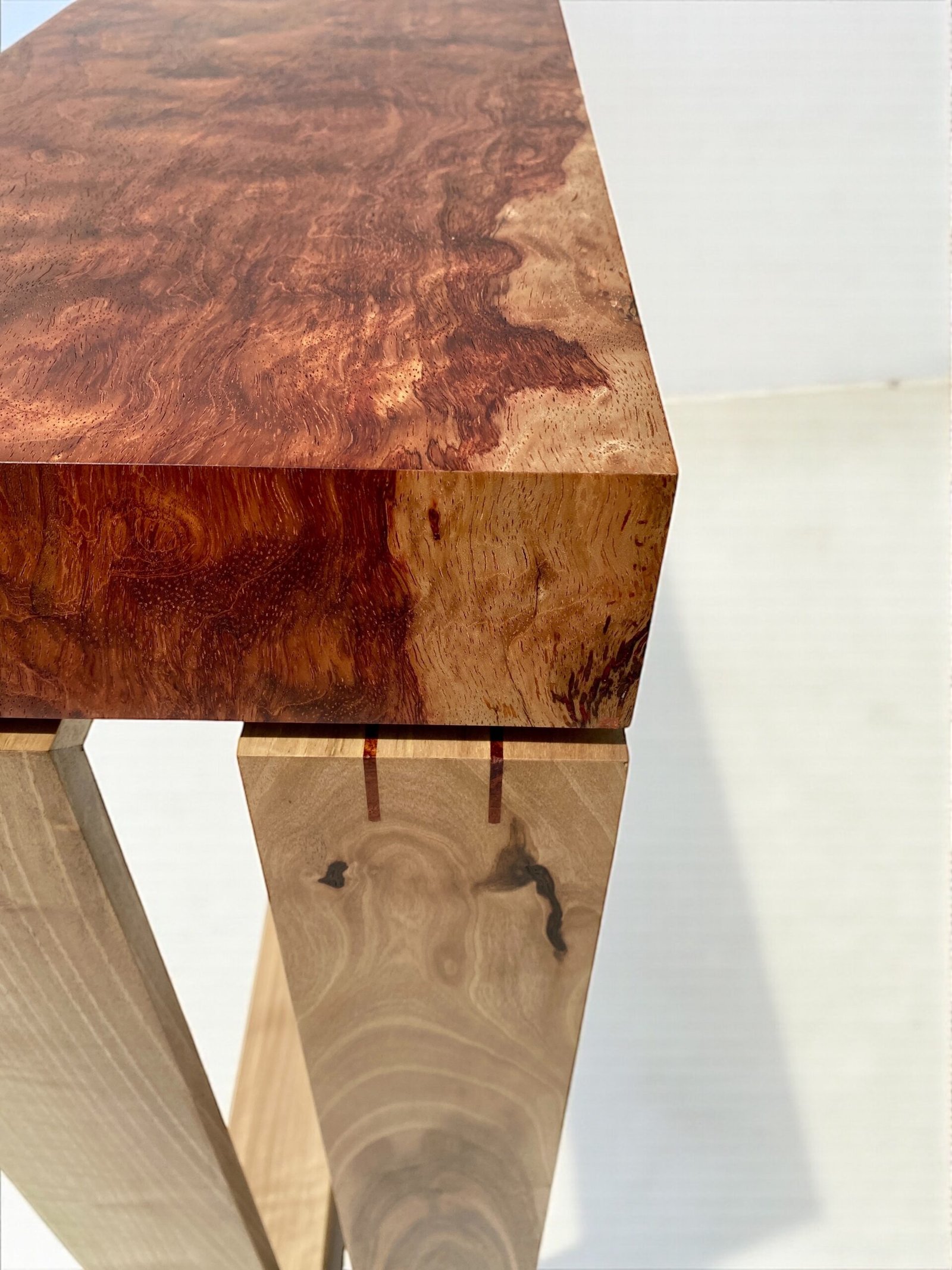 Son plateau cuivré, aux reflets fauves, est mis en valeur par un volume continu réalisé en coupes d’onglet à 45°, qui crée un ruban de bois parfaitement lisible.