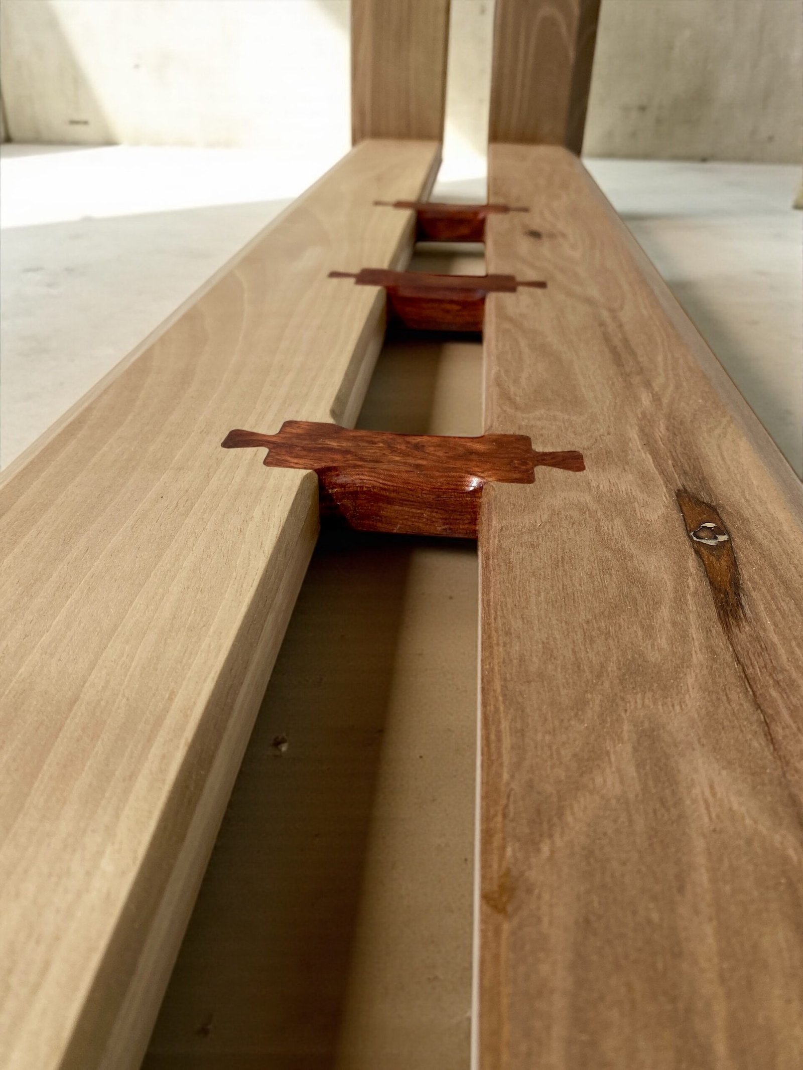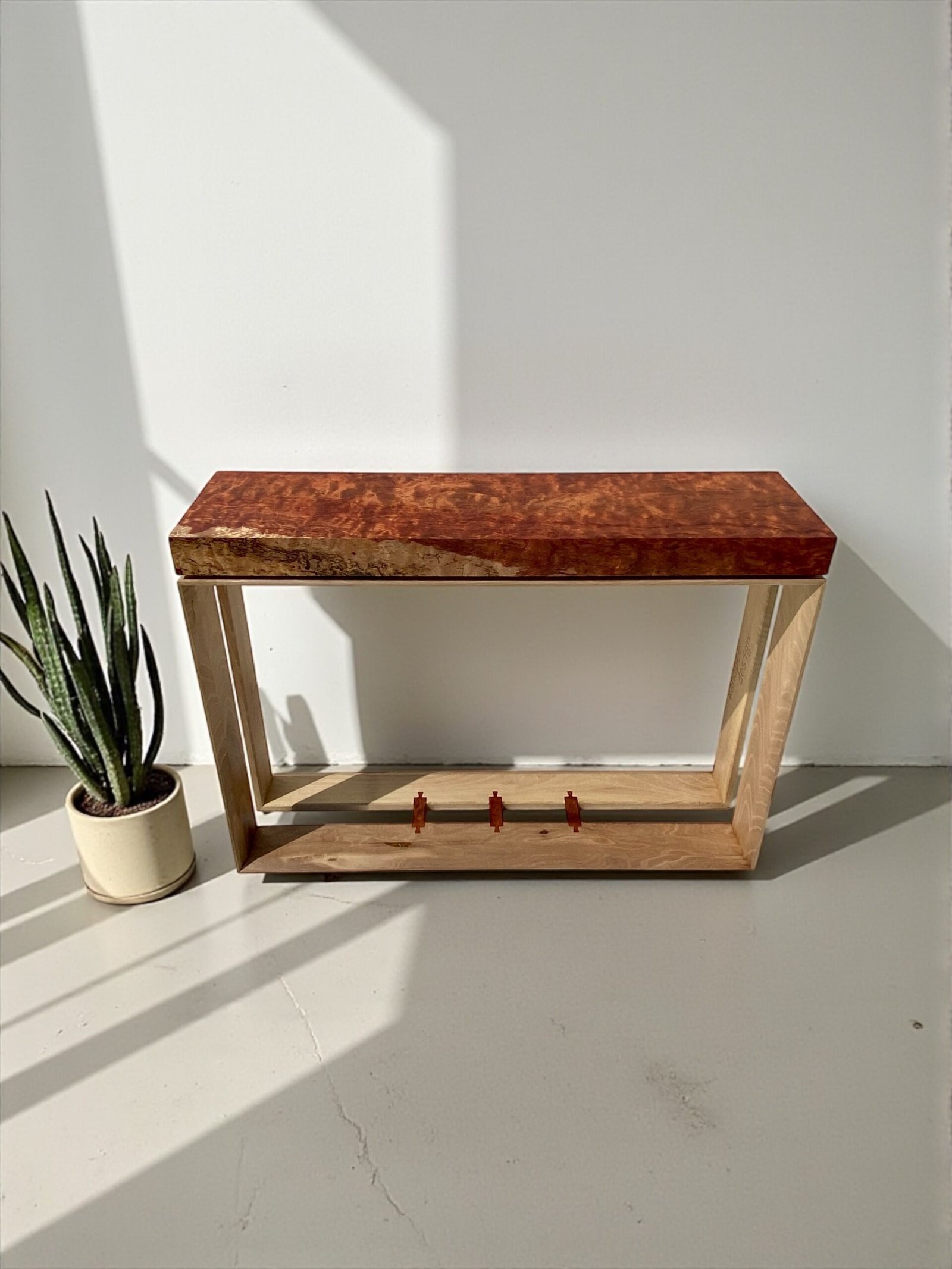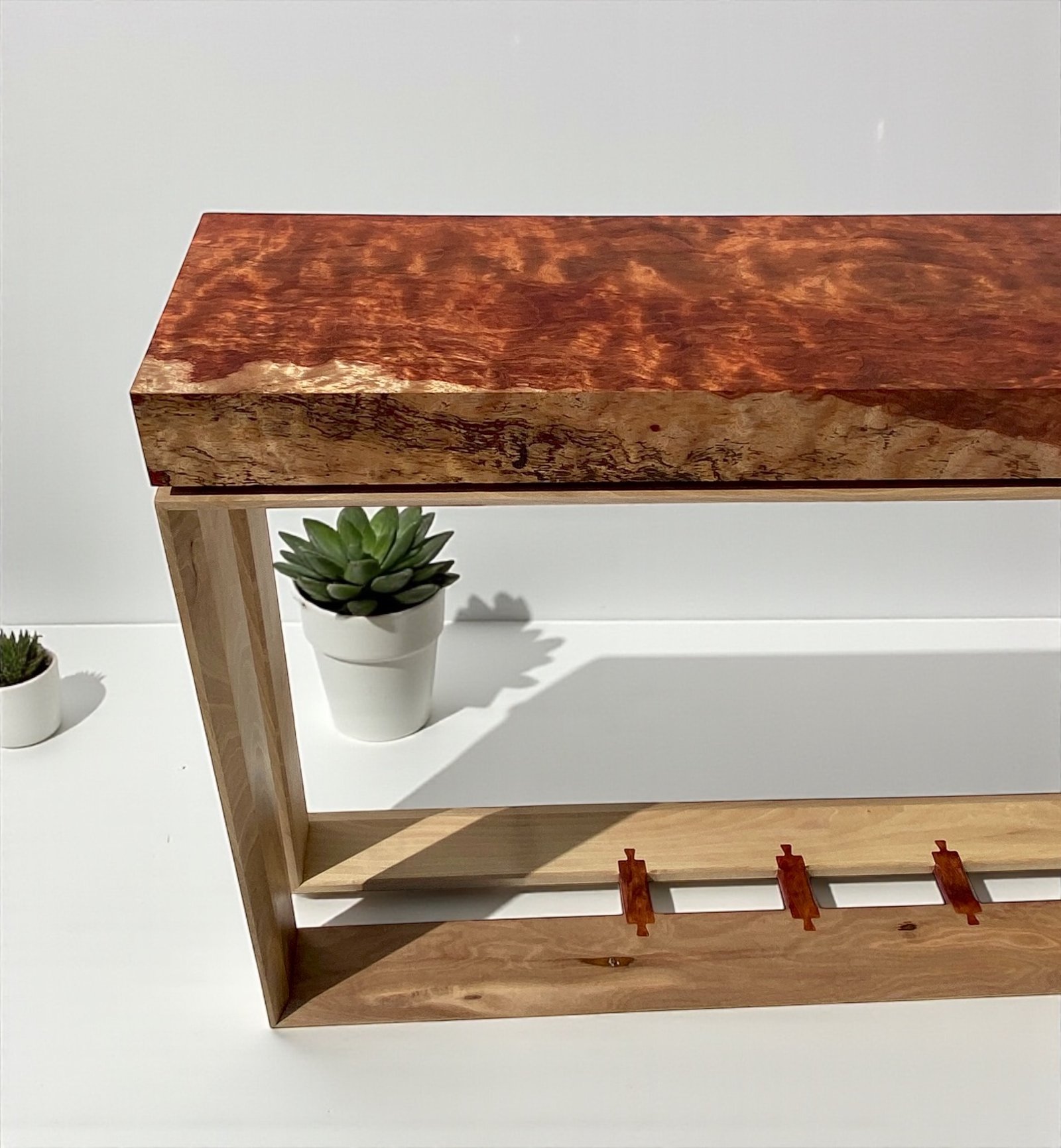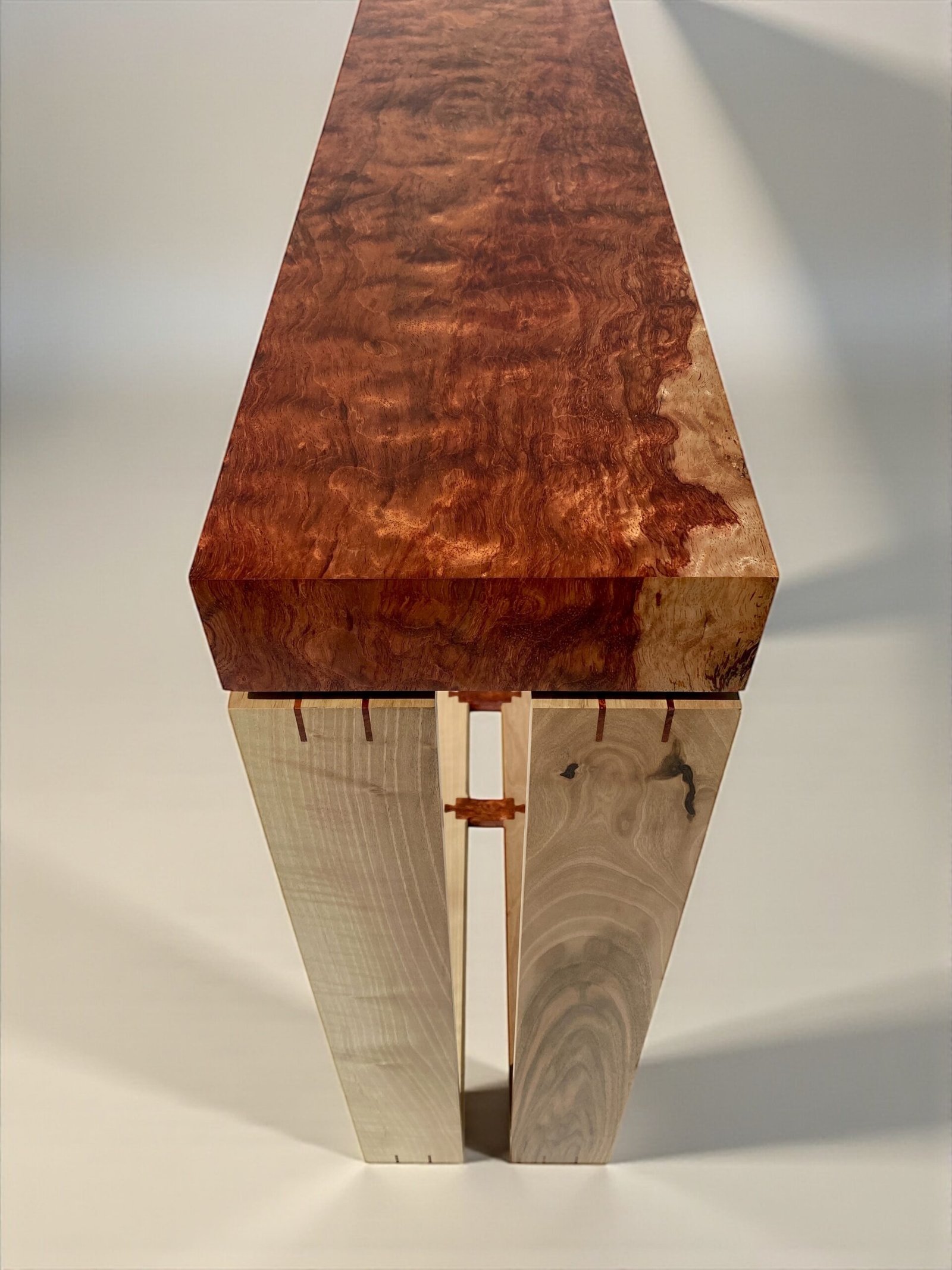Son plateau cuivré, aux reflets fauves, est mis en valeur par un volume continu réalisé en coupes d’onglet à 45°, qui crée un ruban de bois parfaitement lisible.