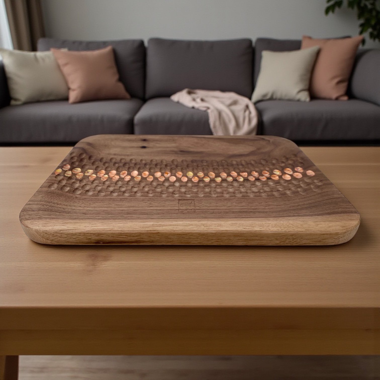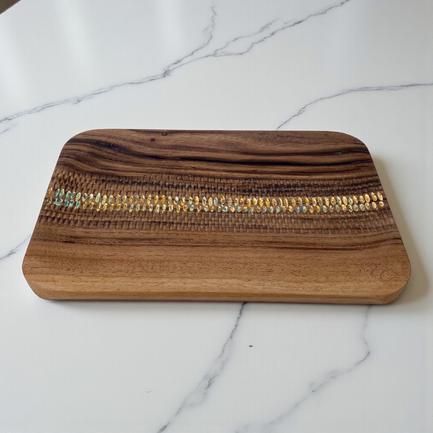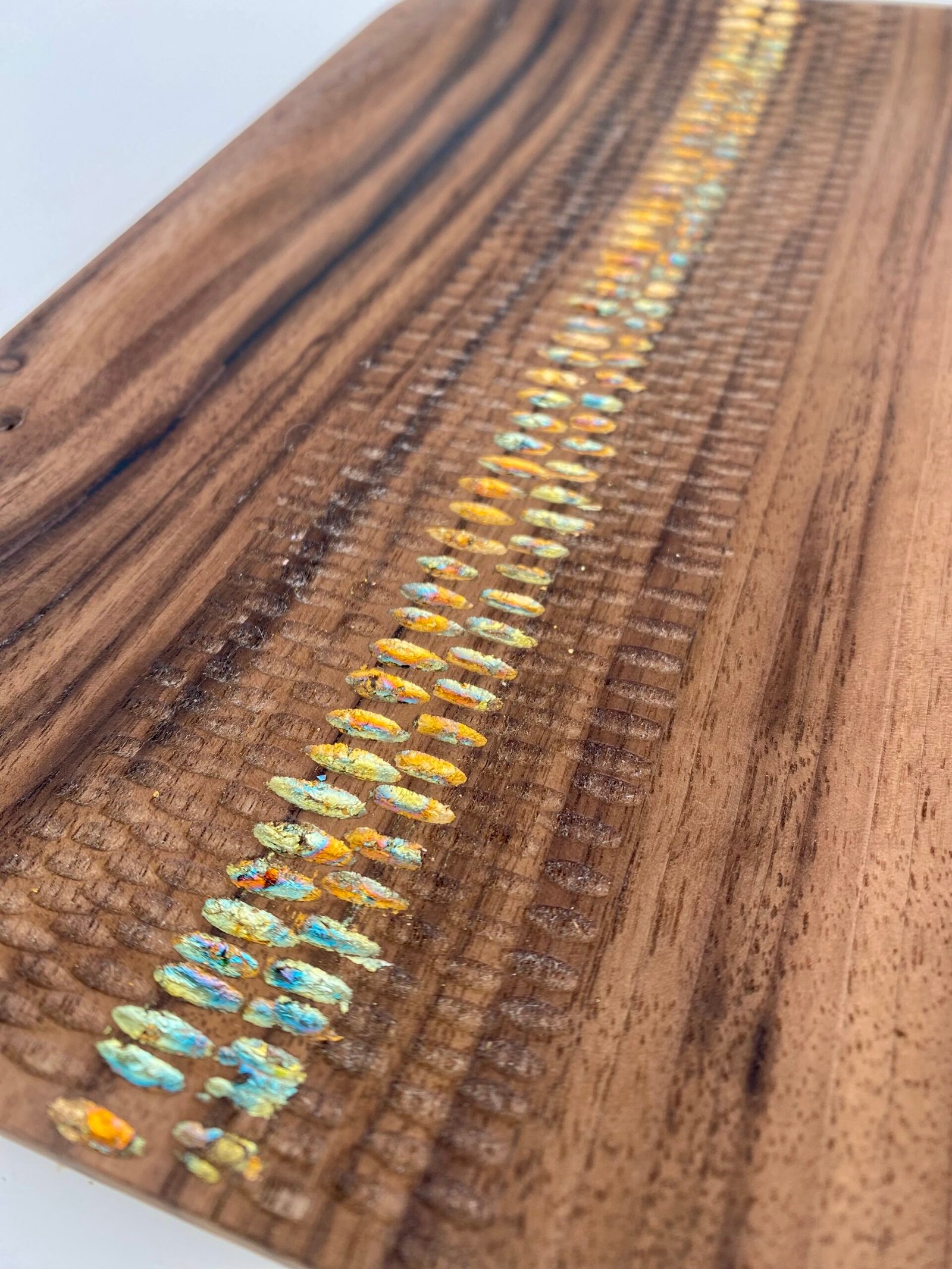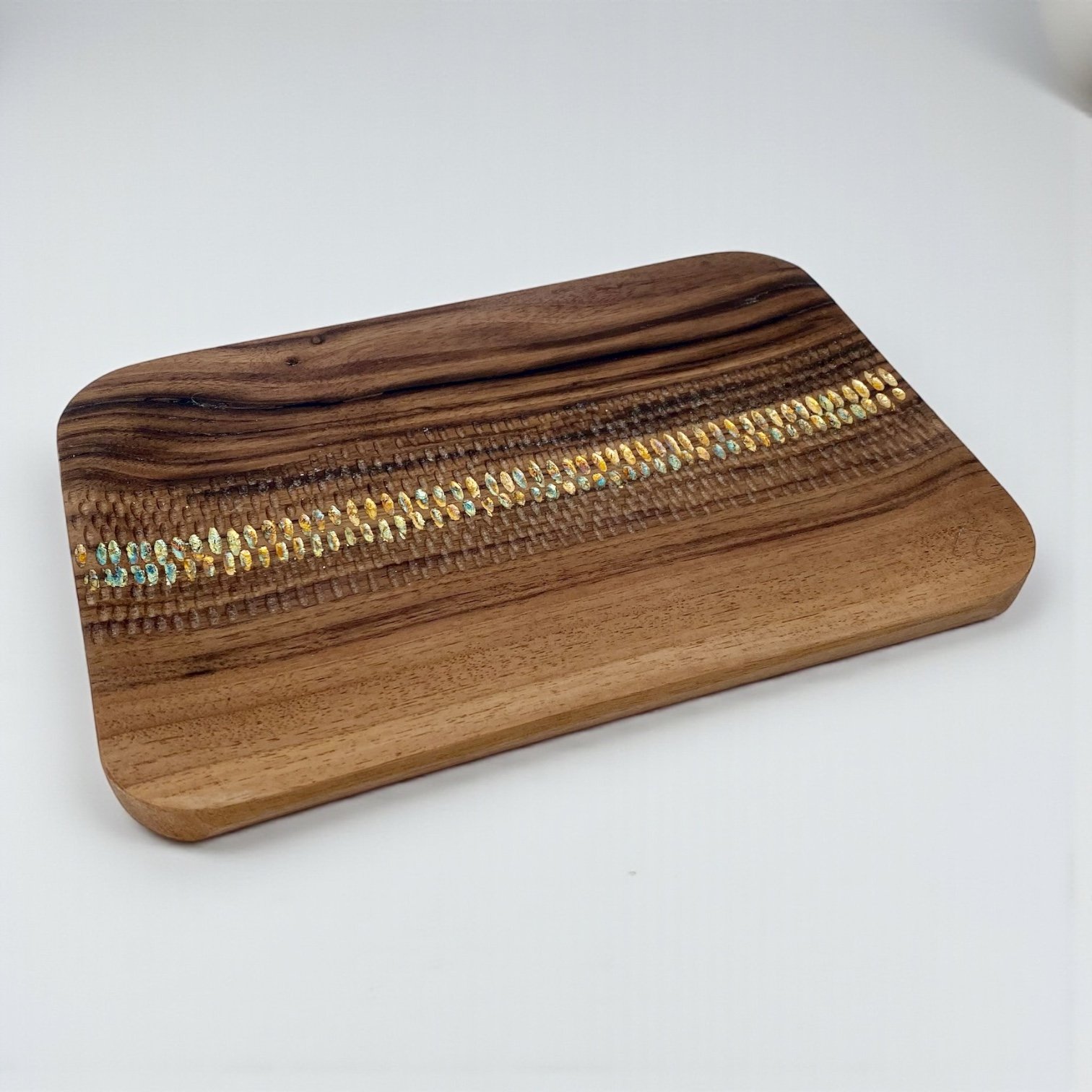 Enfin — uniquement sur les plateaux en Noyer — j’insère un chemin de feuilles de cuivre oxydé, bleuté ou cuivré, comme une ligne lumineuse qui accompagne la sculpture.