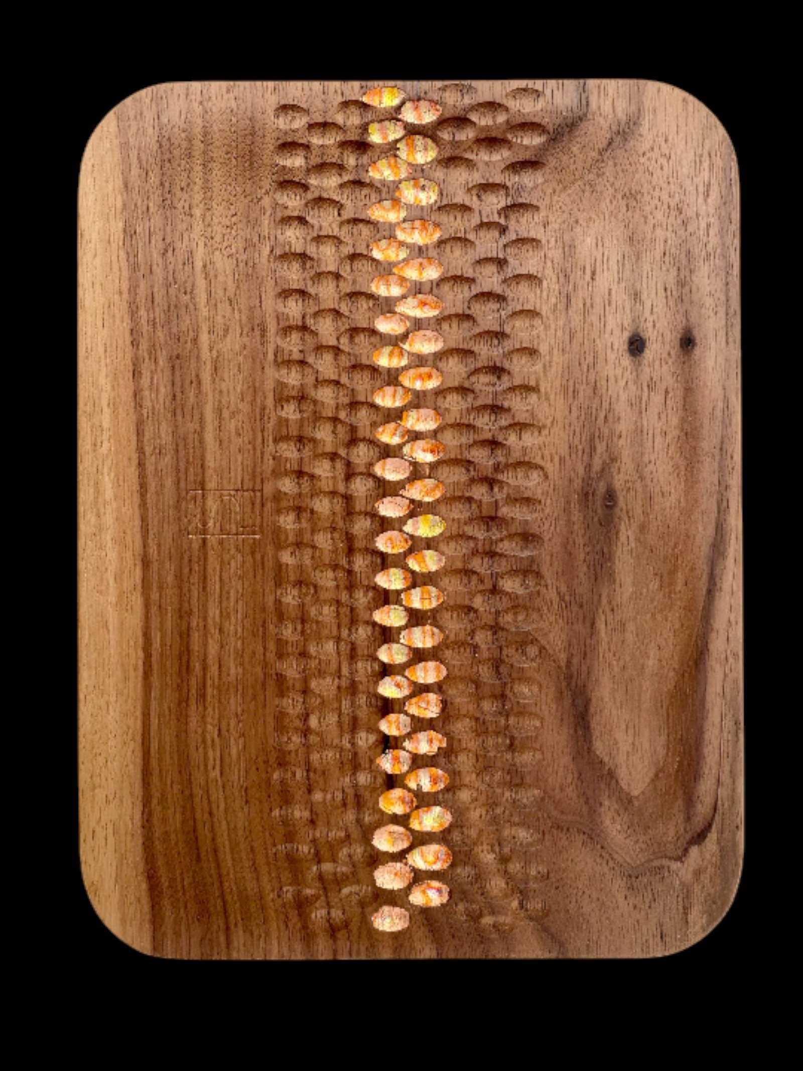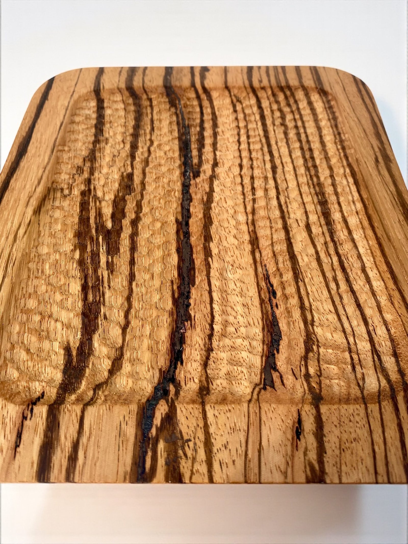 Plateau sculpté en Noyer ou Zébrano, inspiré de l’esthétique japonaise. Motifs réalisés à la gouge, insertion de cuivre oxydé sur les versions en Noyer. Pièces uniques.