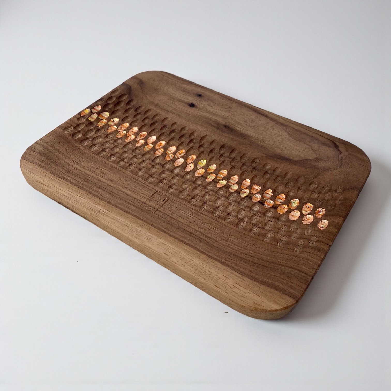 Chaque plateau est légèrement évidé à la gouge, créant une courbe douce et organique. Les motifs sont ensuite repris plus finement pour offrir une esthétique graphique, presque textile.