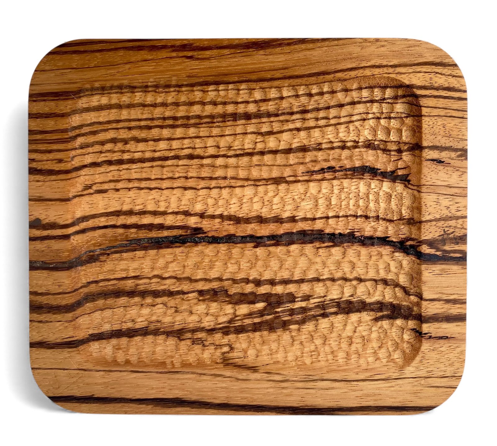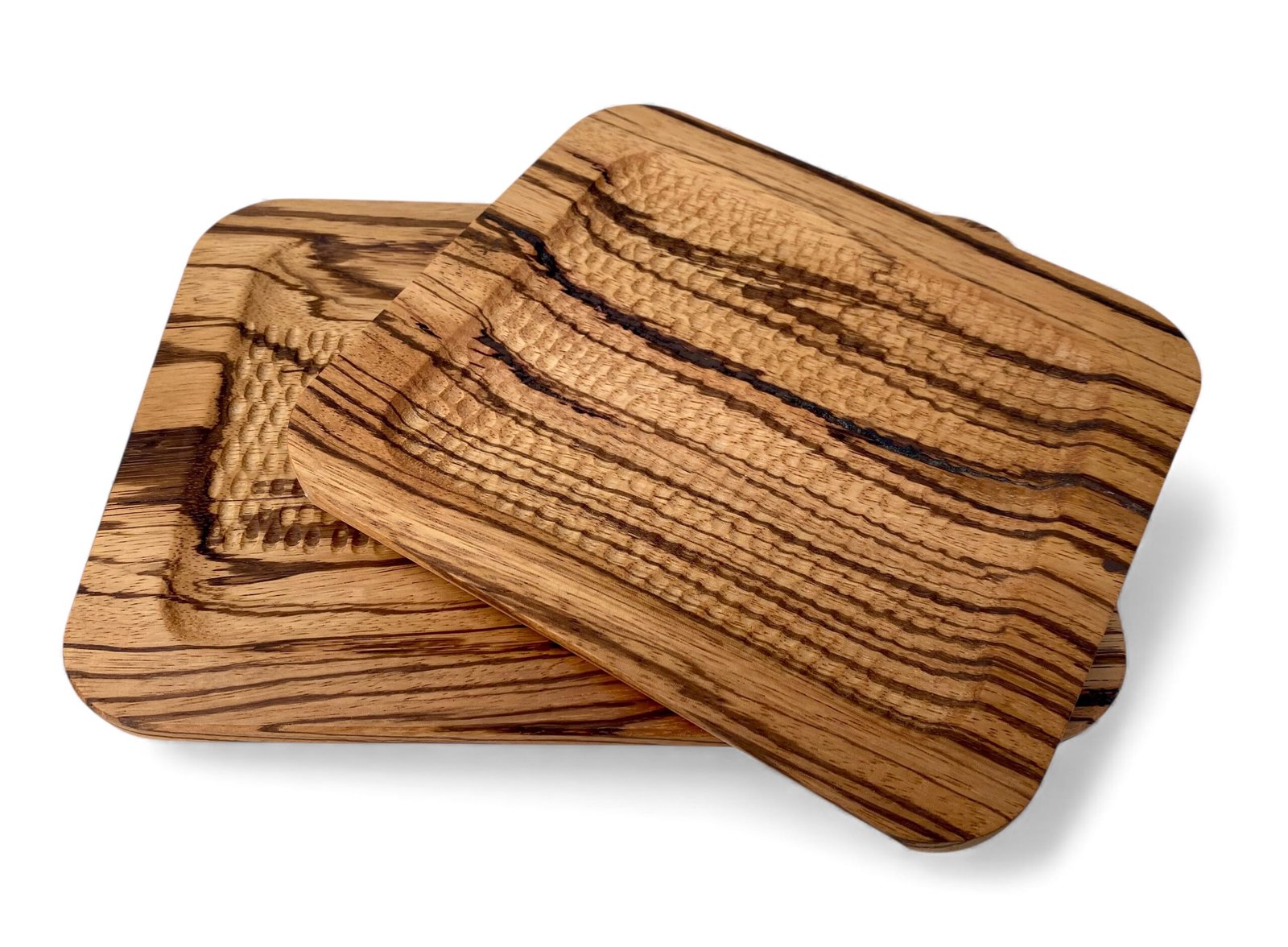 Les plateaux en Zébrano, eux, restent vierges de cuivre : la richesse naturelle de leur veinage suffit à elle-même.