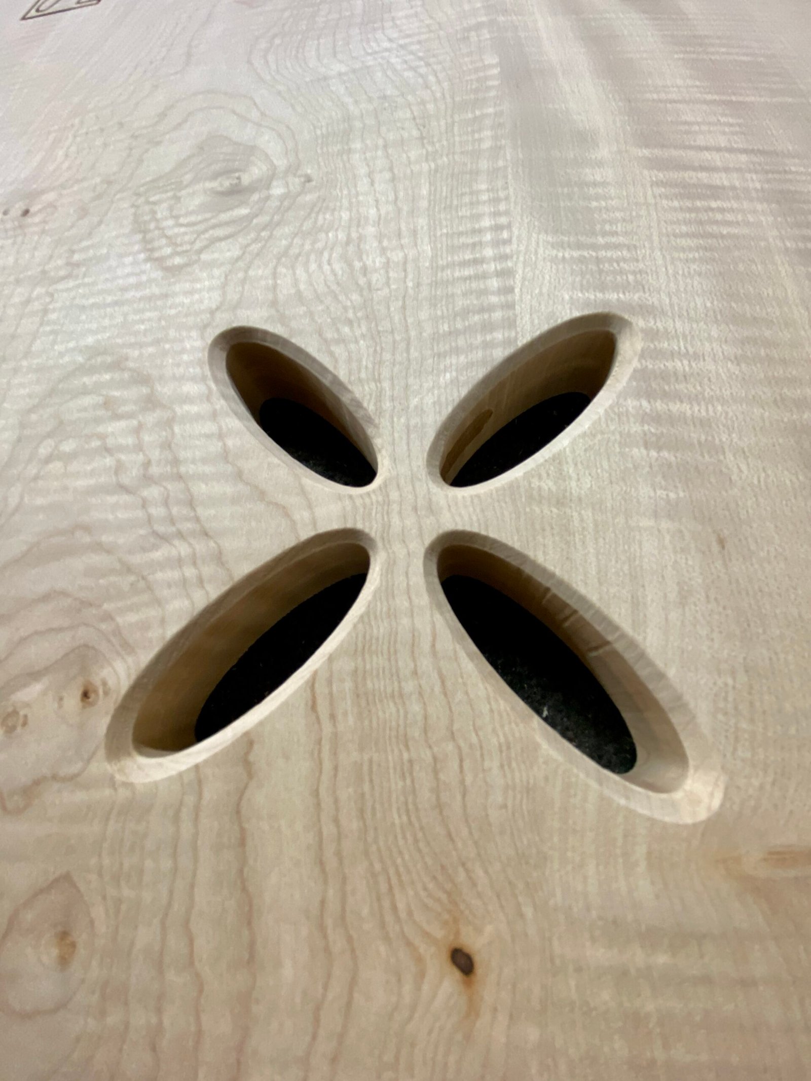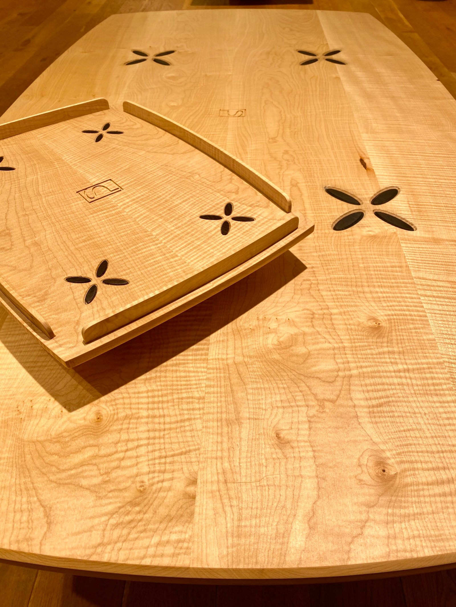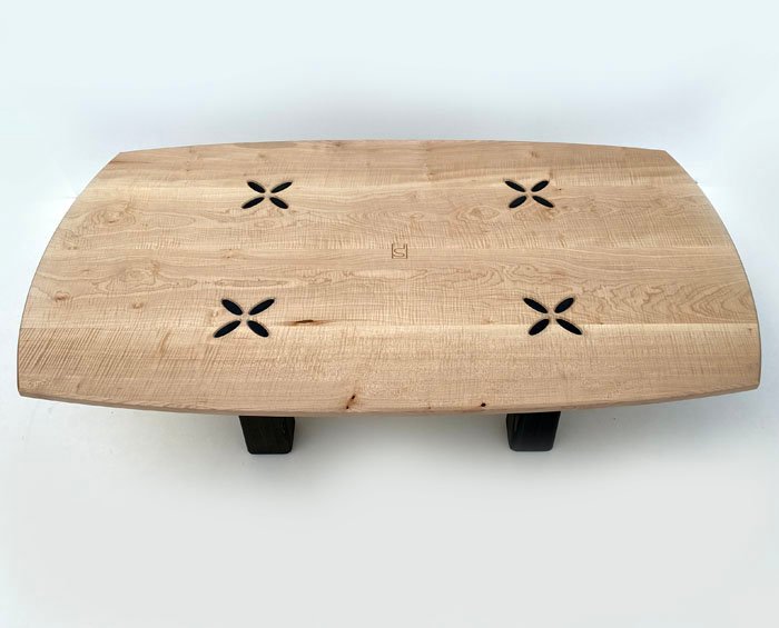 La structure reprend un assemblage traditionnel tenon-mortaise : le plateau agit comme la mortaise, tandis que les pieds sculptés en forme de pétales s’y insèrent avec précision. Résultat : une table à la fois élégante, stable et parfaitement cohérente visuellement.