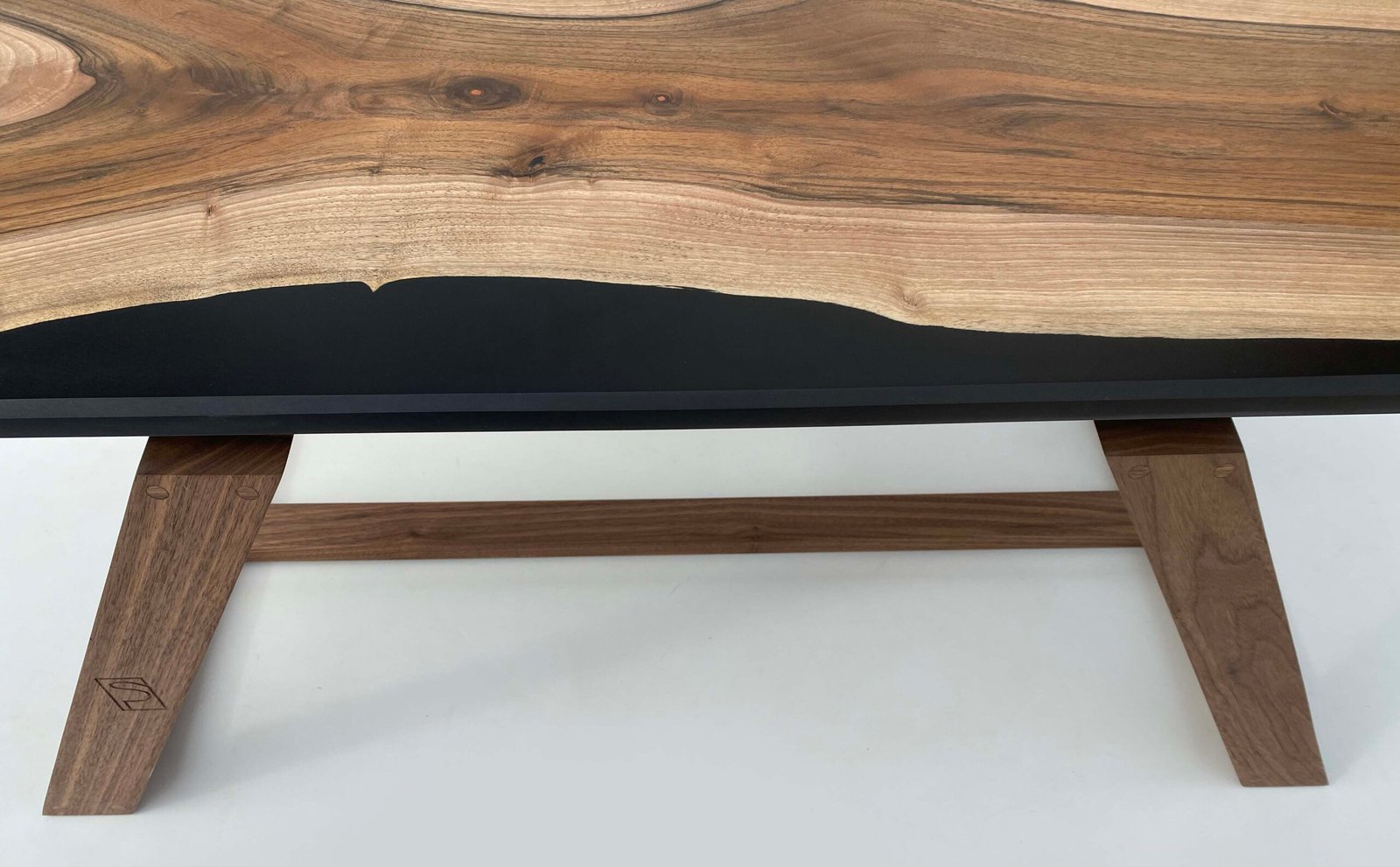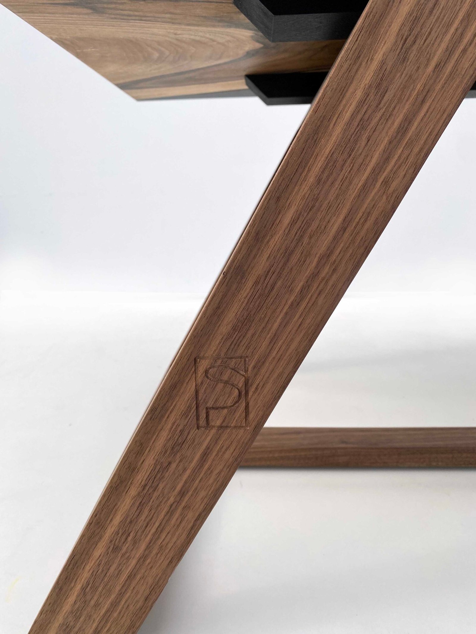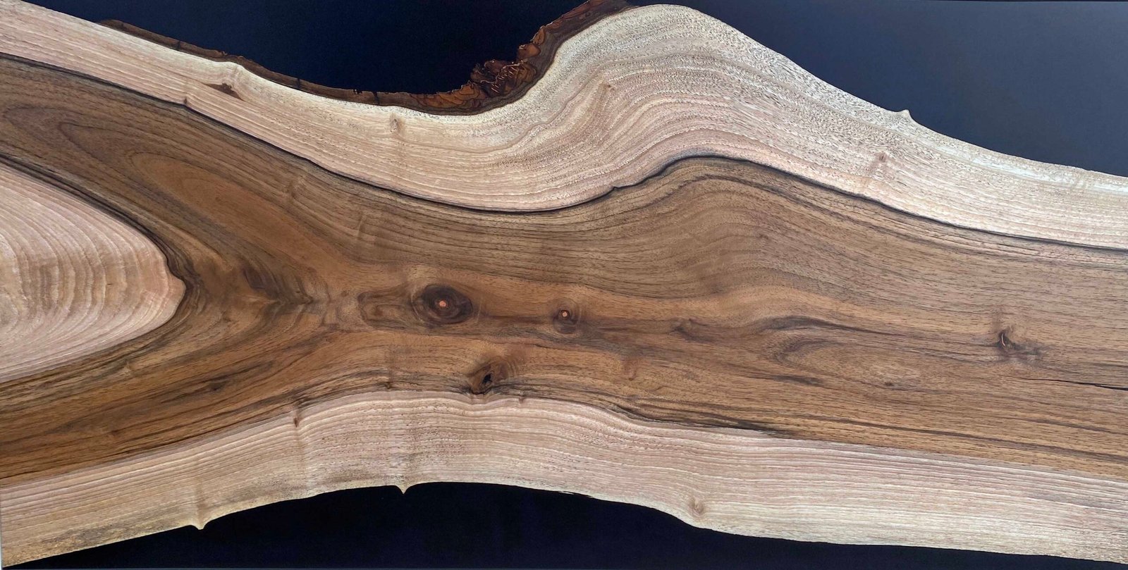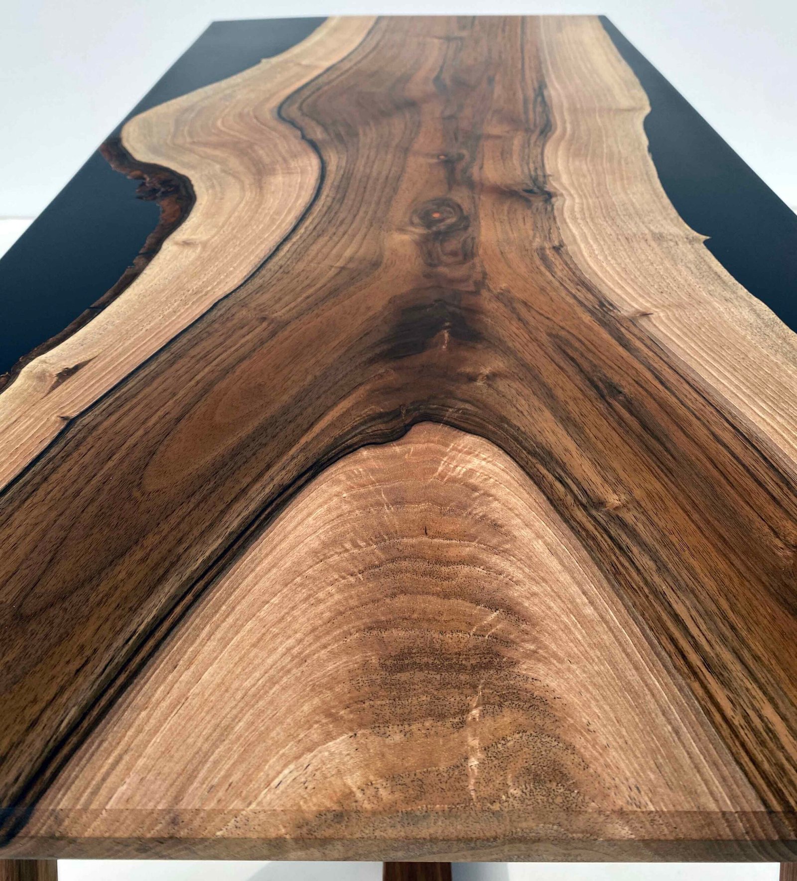 Le plateau repose sur un piétement trapézoïdal en noyer américain massif. Un contraste volontaire entre l’organique et le géométrique, entre la liberté des lignes naturelles et la rigueur d’un dessin plus architectural. Les assemblages visibles témoignent d’un travail précis et assumé.