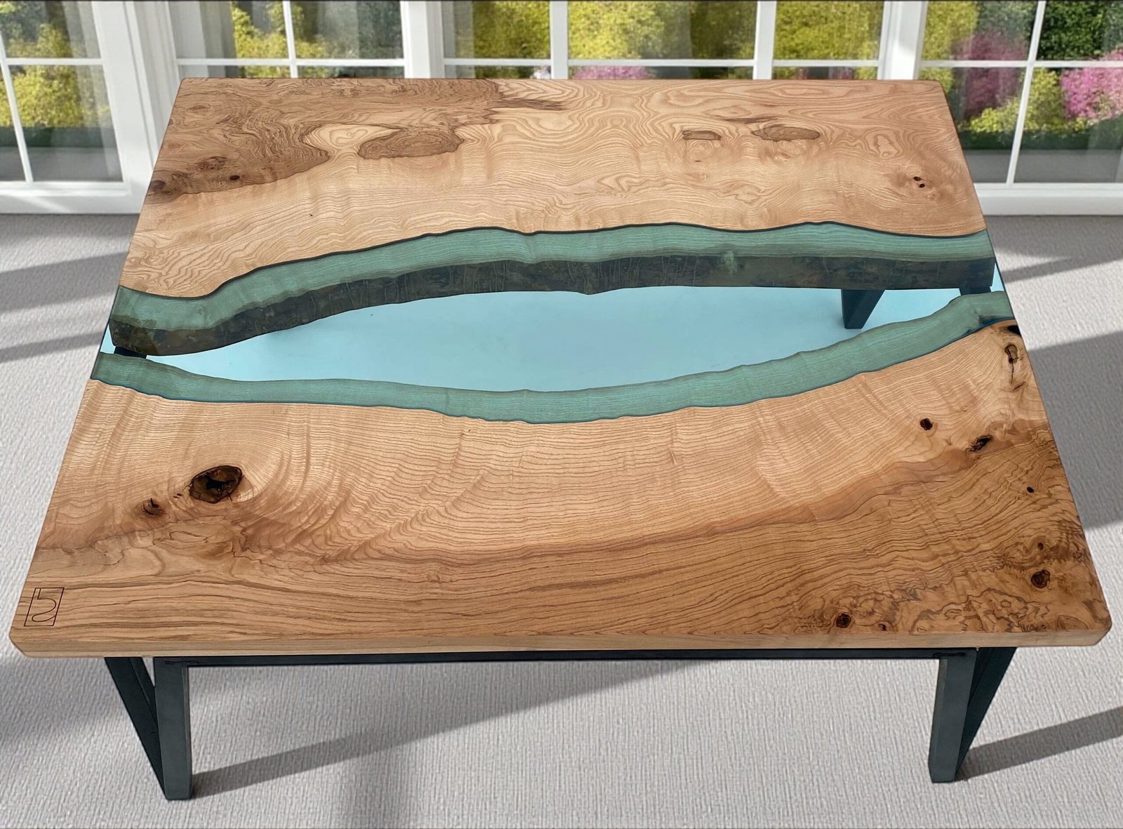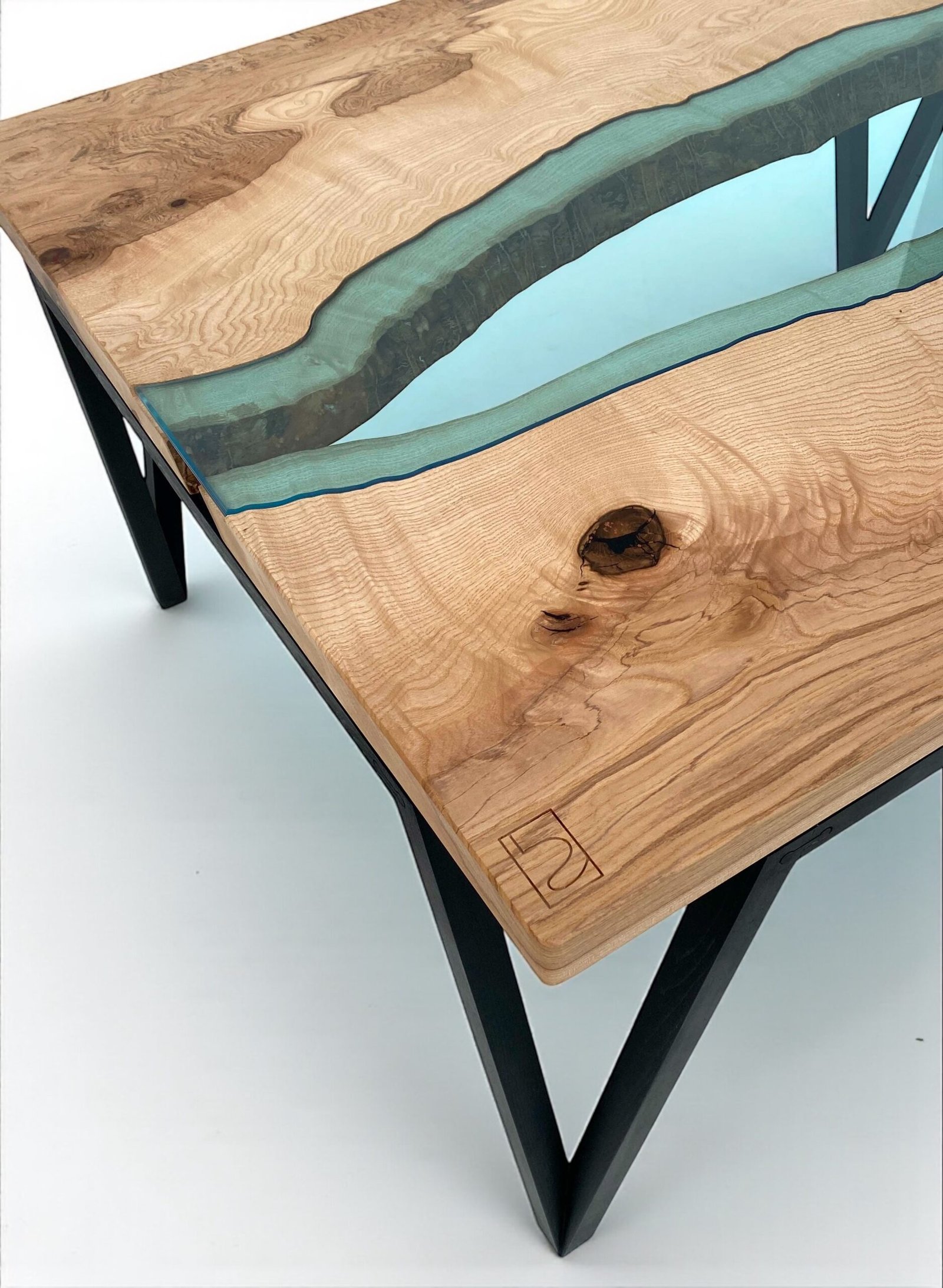Au centre du plateau, une “rivière” de verre de 10 mm, découpée sur mesure par un artisan verrier, s’insère parfaitement entre deux planches de frêne soigneusement sélectionnées. Le travail d’ajustement — retirer juste la profondeur du verre, suivre chaque courbe — donne à l’ensemble une précision et une fluidité uniques.