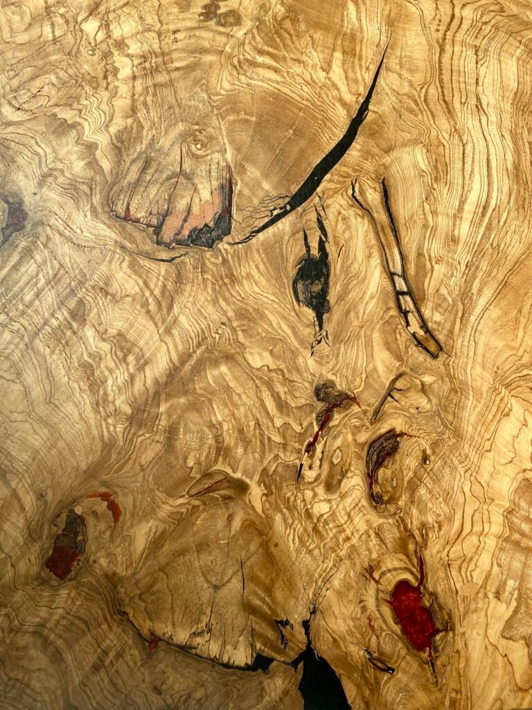 J’ai d’abord dessiné à la main un tracé évoquant une rivière, puis l’ai numérisé pour le reporter sur deux planches de Frêne Olivier aux lignes naturelles et vibrantes.